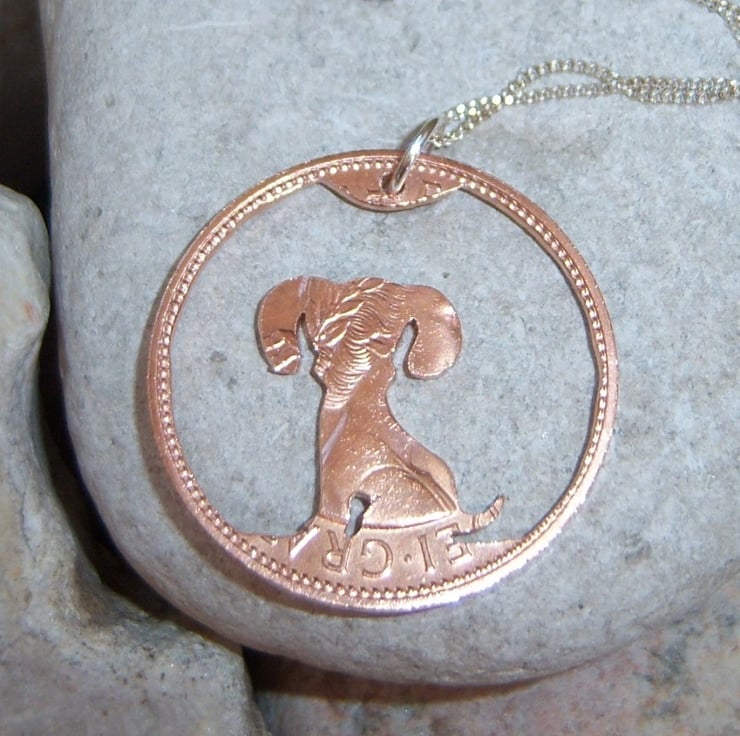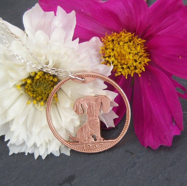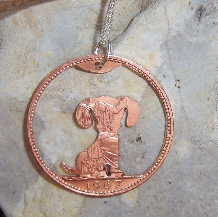 A dog cut from a 1967 bronze penny coin. (This dog is Version 1 in my collection). It has been hand-cut with a fine-bladed jeweller's saw, it has NOT been cut using a laser.