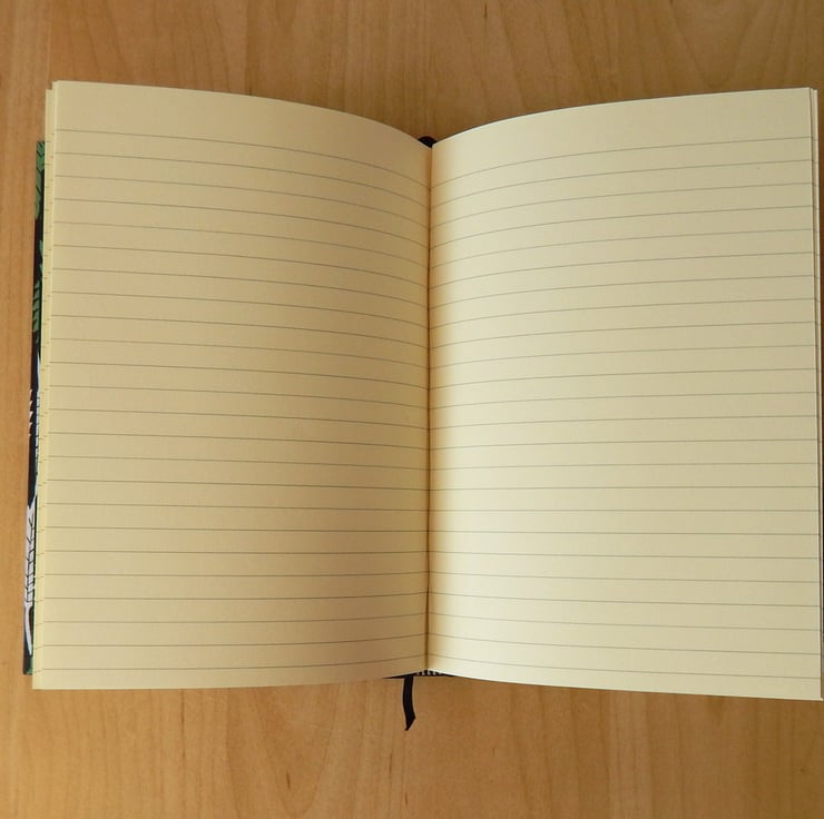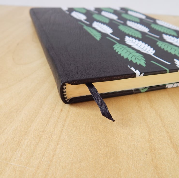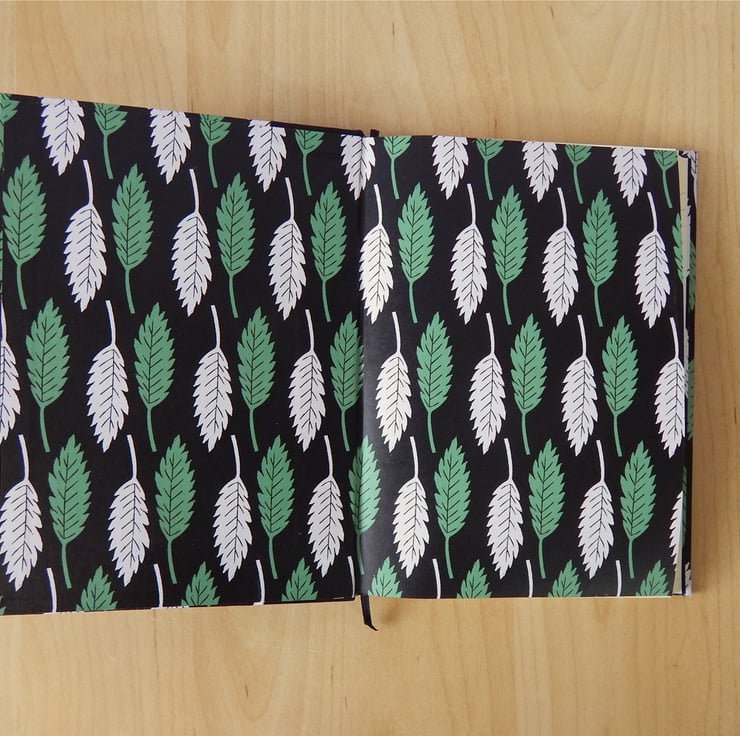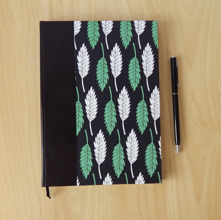 Hand bound in a traditional style, the journal has covers printed with green and white oak leaves on a black background.