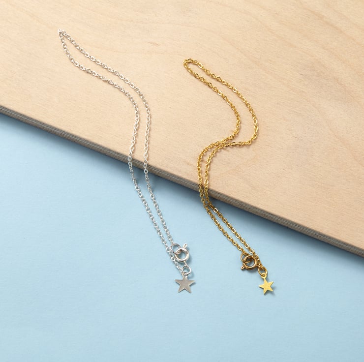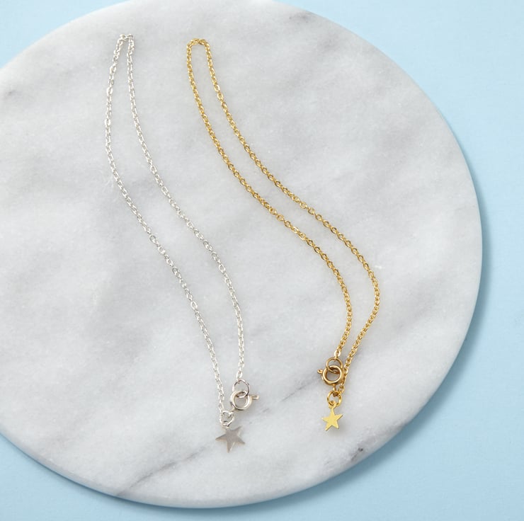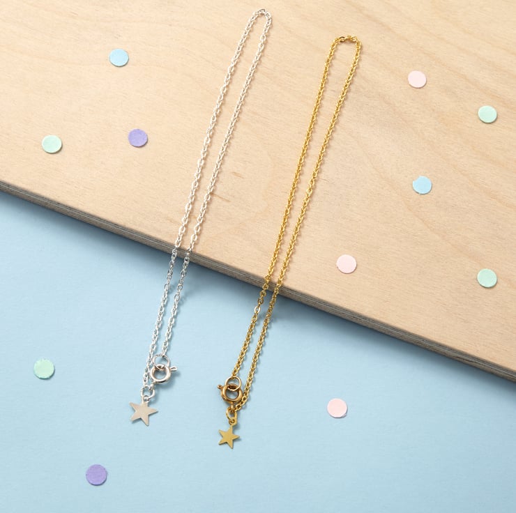 This minimalist silver or gold anklet is made with fine cable chain and is finished at the clasp with a small star pendant.