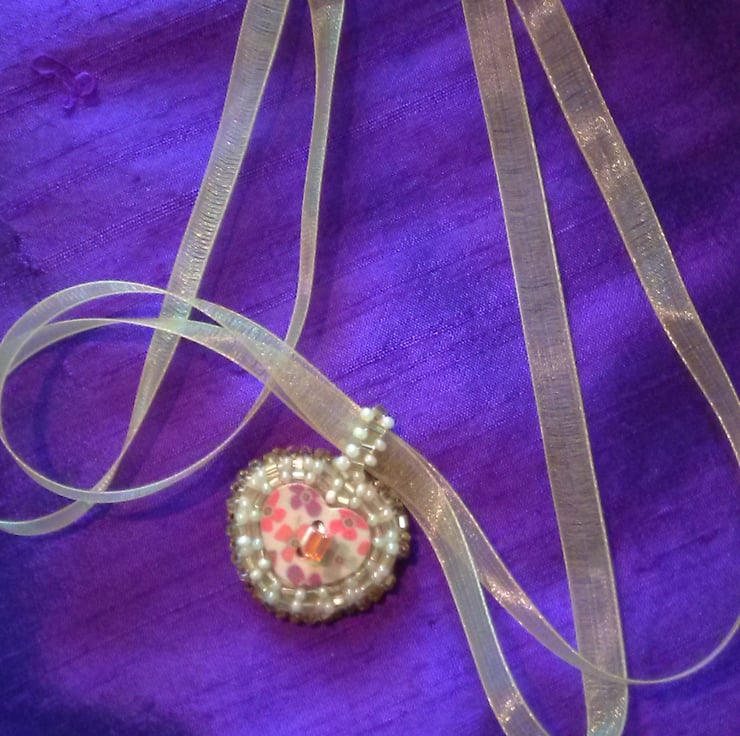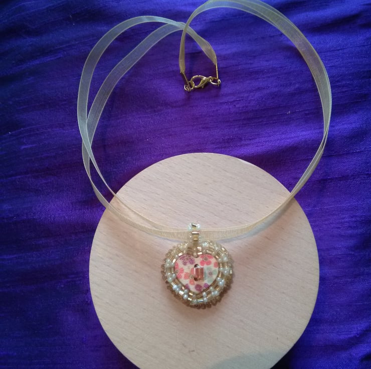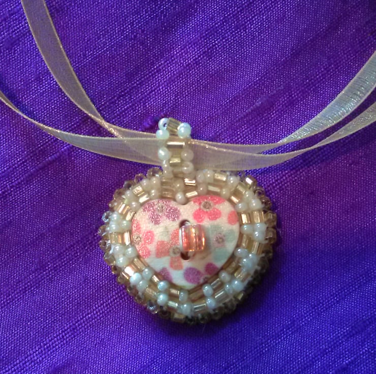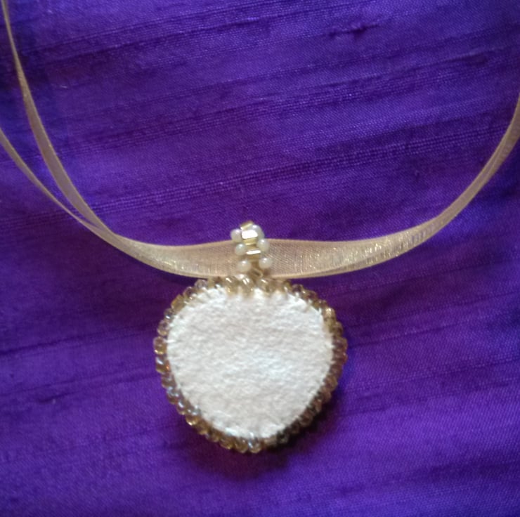 A sweet heart-shaped and flower patterned central button is surrounded by delicate bead embroidery using cream seed beads and gold coloured delica beads. This pretty pendant is backed with cream Ultrasuede and hangs from two strands of fine organza ribbon in a toning gold colour. It fastens with a gold coloured lobster clasp.