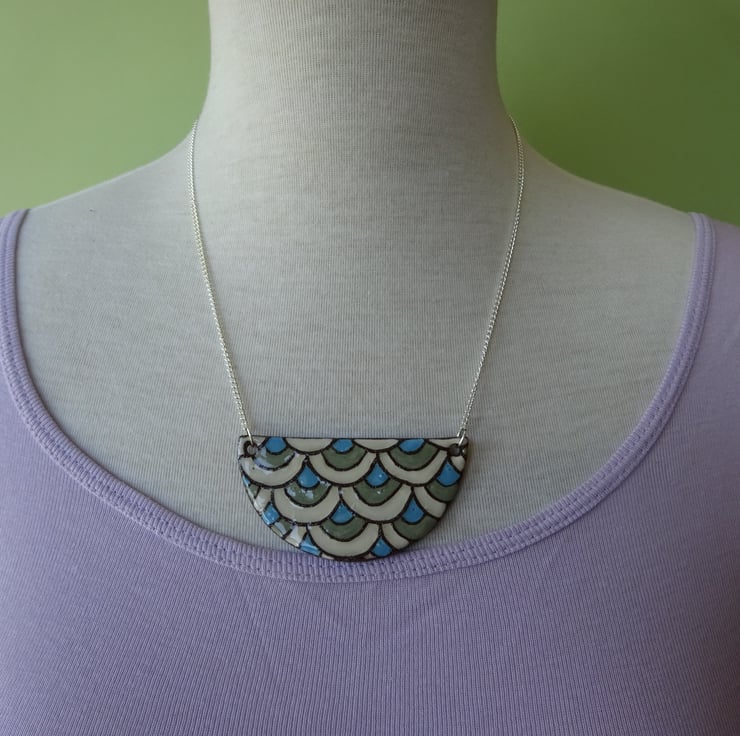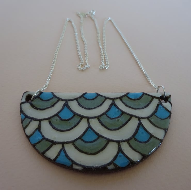 Medium bib necklace in a fish scale geometric pattern. Blue, grey and white on a silver chain.