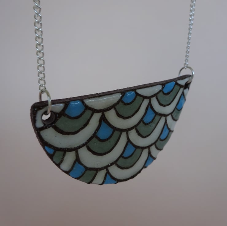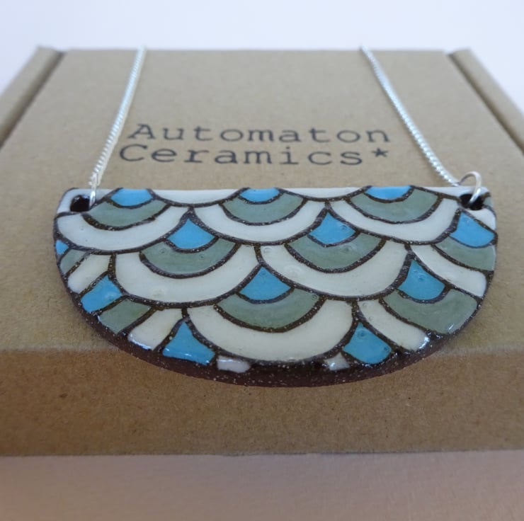 Each piece starts life from a slab of clay which is rolled out and embossed with a handmade block. The colours are then added with a range of slips, the pendant is finished with a clear glaze and fired to a high temperature to intensify the colour of the clay and slips. The bib pendant is then hung on a silver plated curb chain.