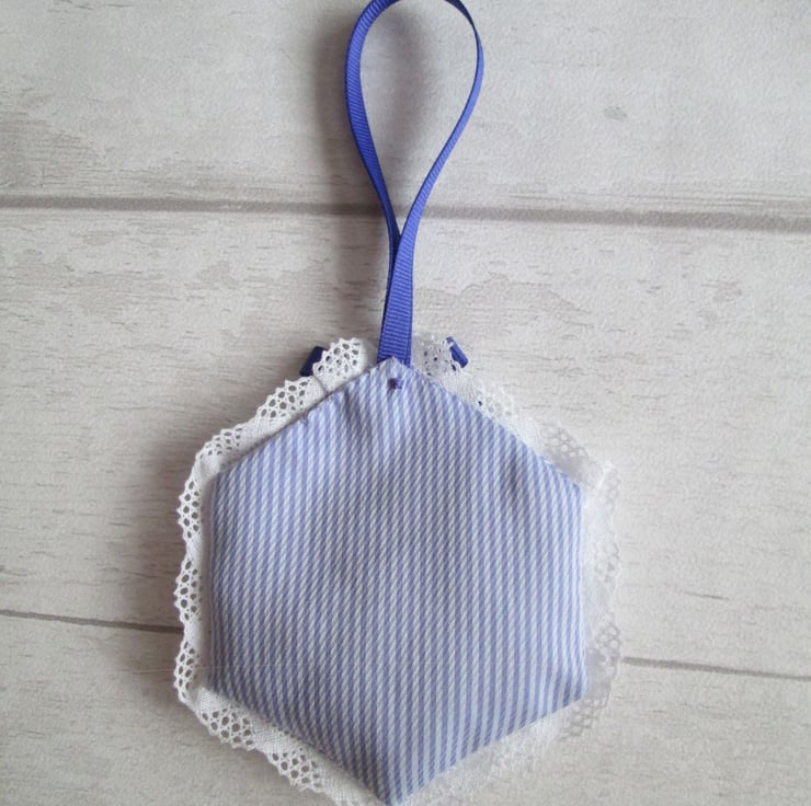 A trio of pretty lace edged lavender bags made from upcycled shirting in a fine lavender/lilac stripe and finished with coordinating ribbon hanging loops and bows. Lightly filled with lavender so they can either be hung on a clothes hanger or laid flat amongst items in a drawer. without causing creases to your garments. Approximately 10 cm in diameter.