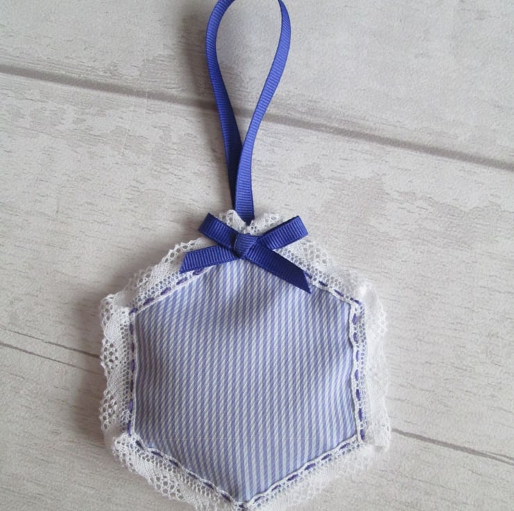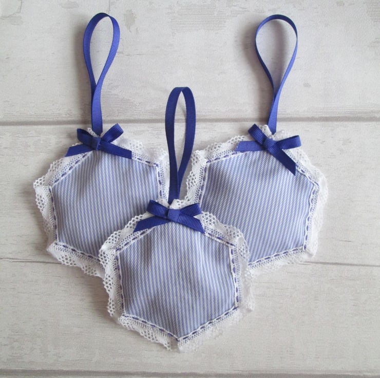 A trio of pretty lace edged lavender bags made from upcycled shirting in a fine lavender/lilac stripe and finished with coordinating ribbon hanging loops and bows. Lightly filled with lavender so they can either be hung on a clothes hanger or laid flat amongst items in a drawer. without causing creases to your garments. Approximately 10 cm in diameter.