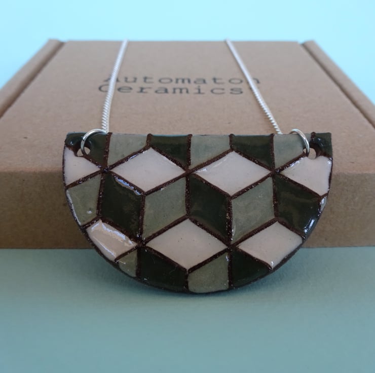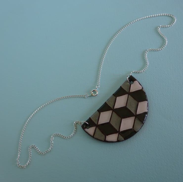 Medium bib necklace in a geometric optical illusion cube pattern. Black, grey and white pendant on a silver chain.
