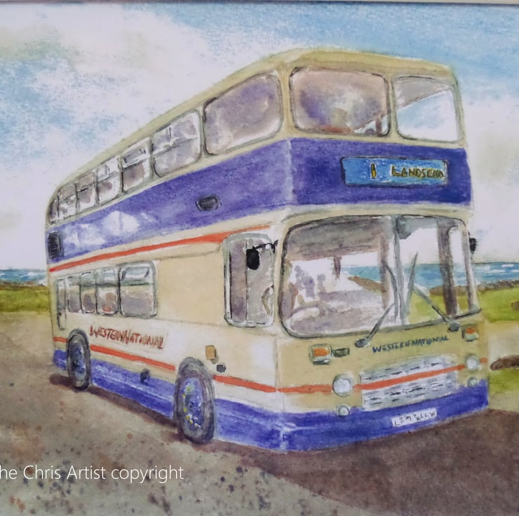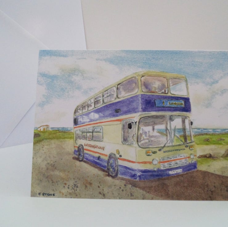 A professionally produced greetings card printed from my original watercolour of a classic Bristol VRT series 3 bus, in Western National 1990's colours, at Lands End in Cornwall. Blank for your own message.