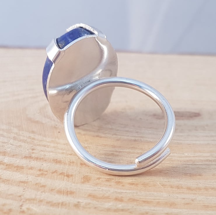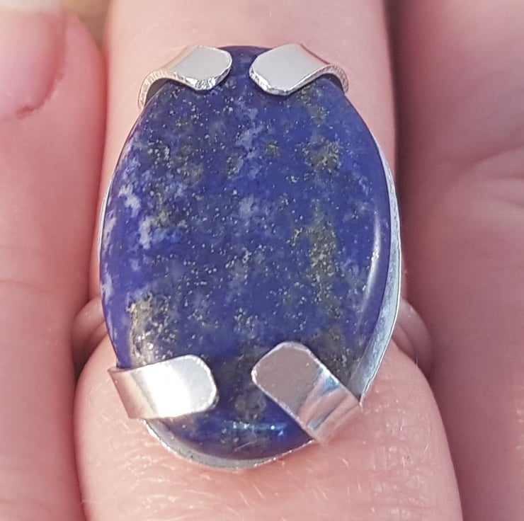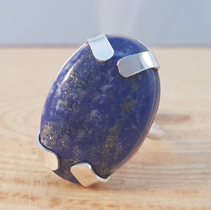 A large, statement ring, made from a beautiful Lapis Lazuli cabochon. The 2.5cm long Lapis Lazuli cabochon has been set using large claws made from sterling silver. 2mm silver wire has been used to make an adjustable ring shank, and then soldered to the setting.