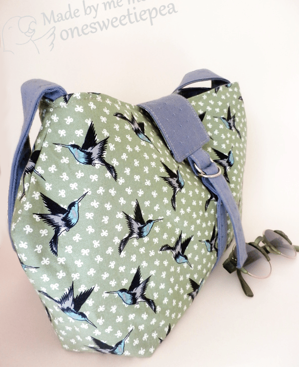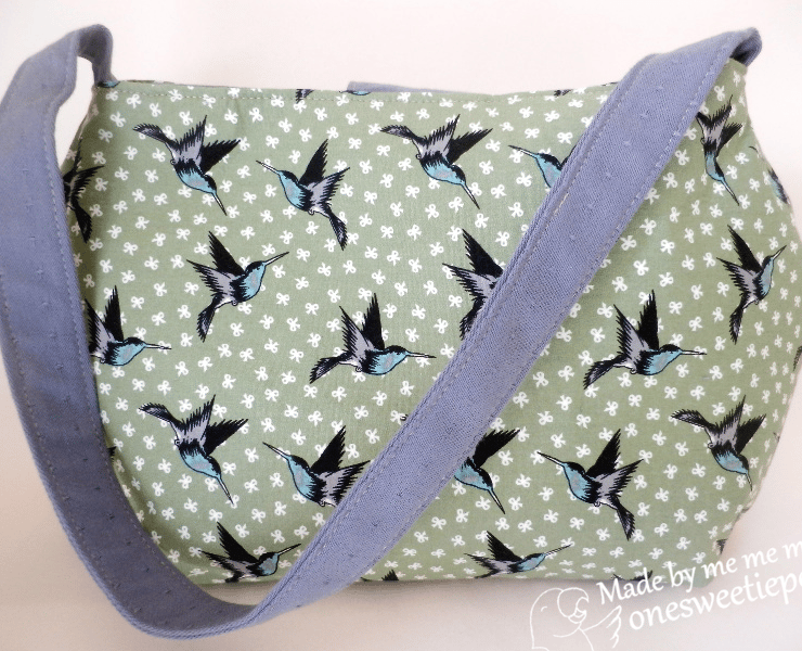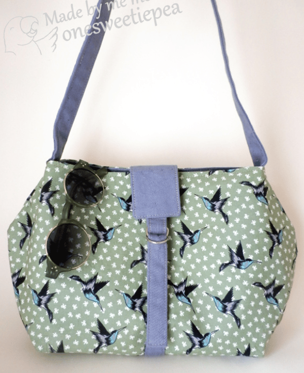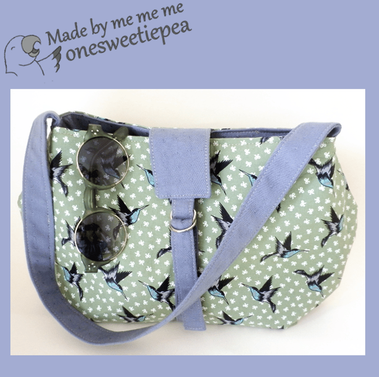 Here we have a beautiful, sage green shoulder bag, covered in pretty swallows and bows.