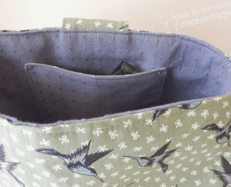The lining is blue and this is also used for the handle, top flap and closure strap. Two D-rings are used to close the bag, allowing for adjustment depending on how full the bag is. A slip pocket inside is handy for keeping things organised.