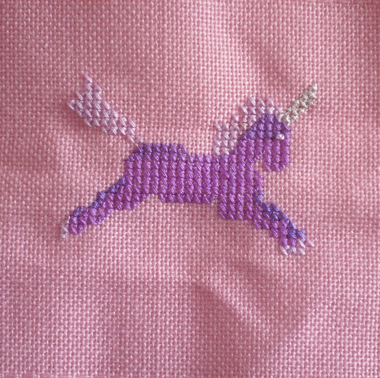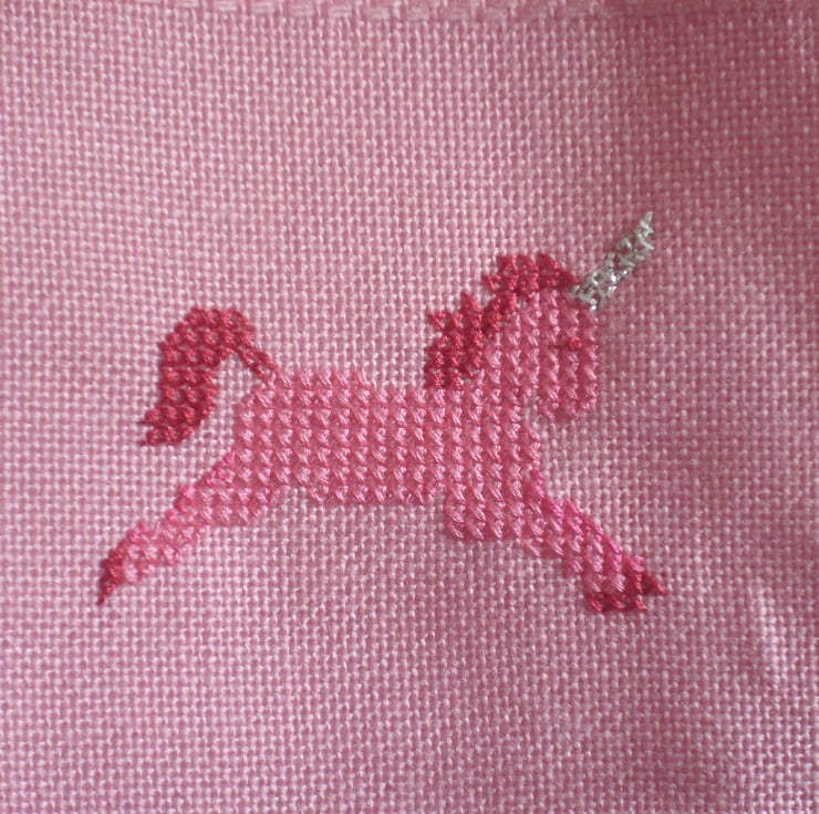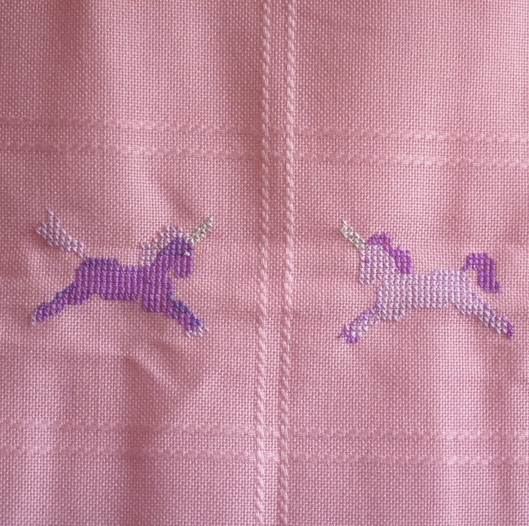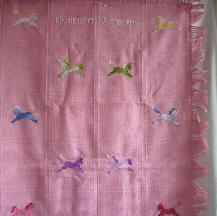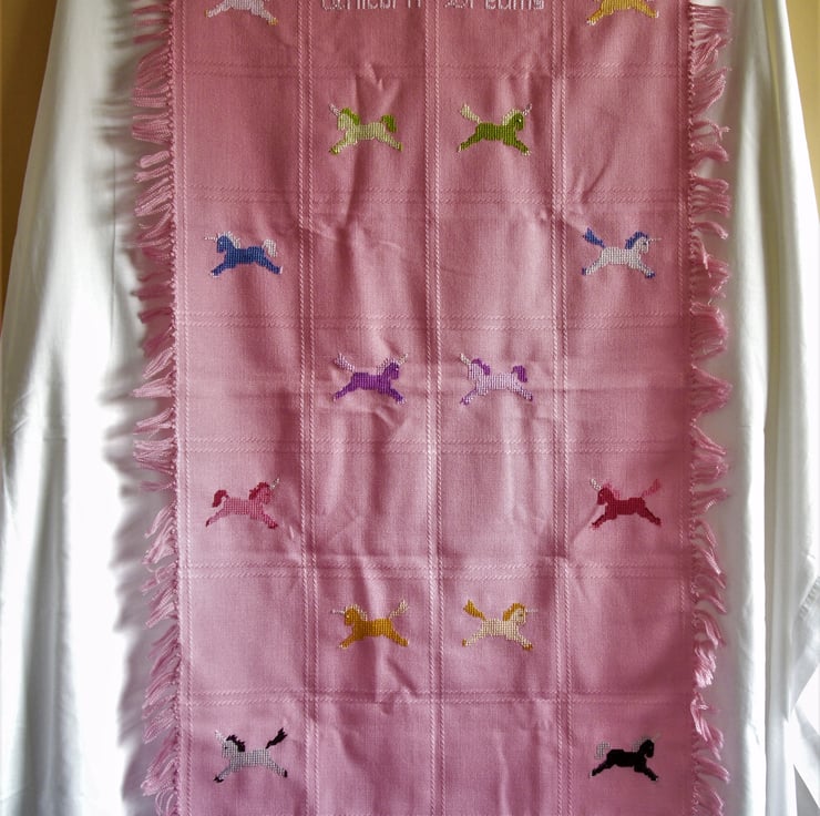 This is a rose pink acrylic Afghan shawl, cot blanket or even a wall-hanging. I have fringed and knotted the edges, and embroidered brightly coloured unicorns with horns worked in sparkly metallic thread. It measures 24" (61cm.) by 40" (102cm.) inside the fringe. The threads are colour-fast and the shawl can be hand-washed in cool water.