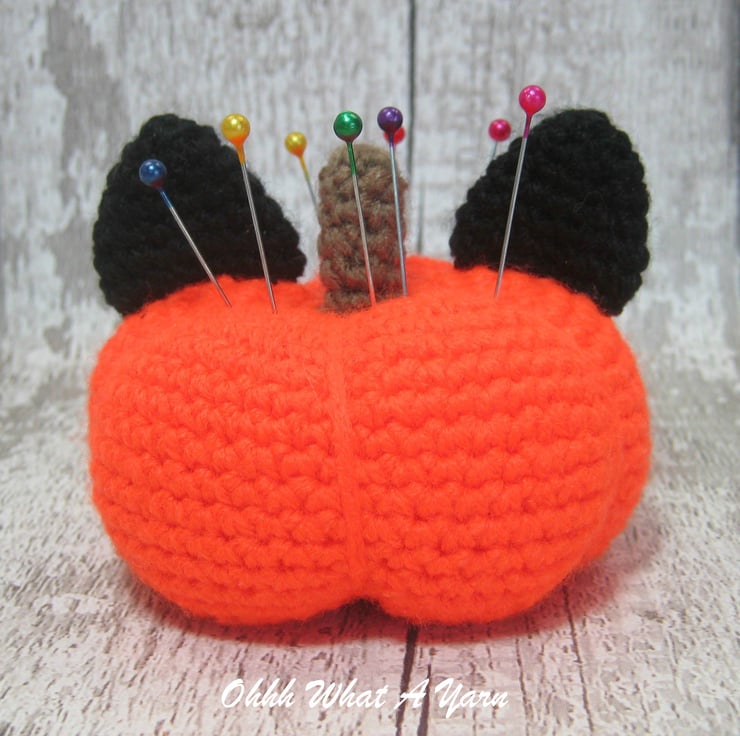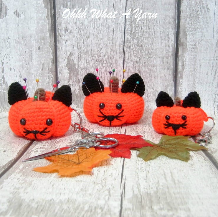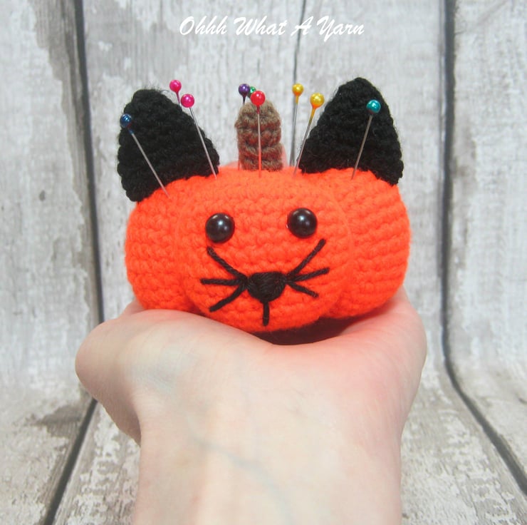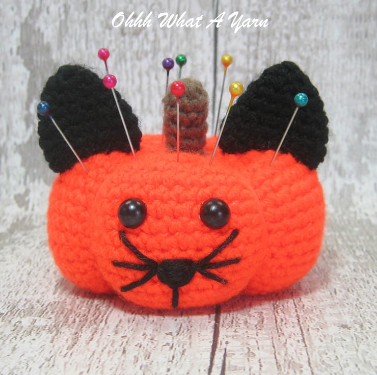 This cute bright orange pumpkin cat pincushion is crocheted using 100 % acrylic yarns.