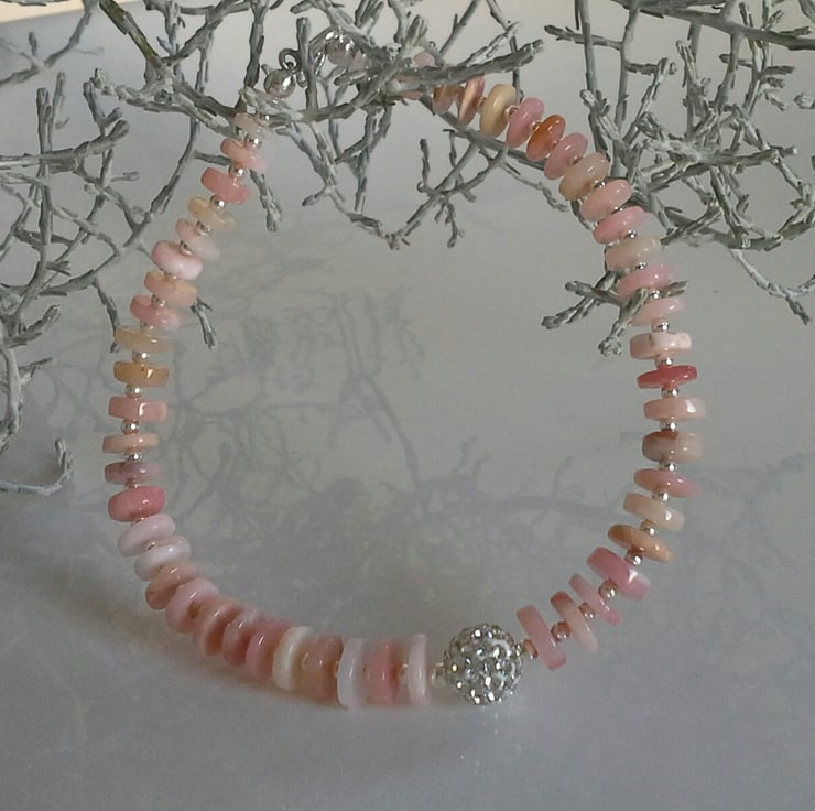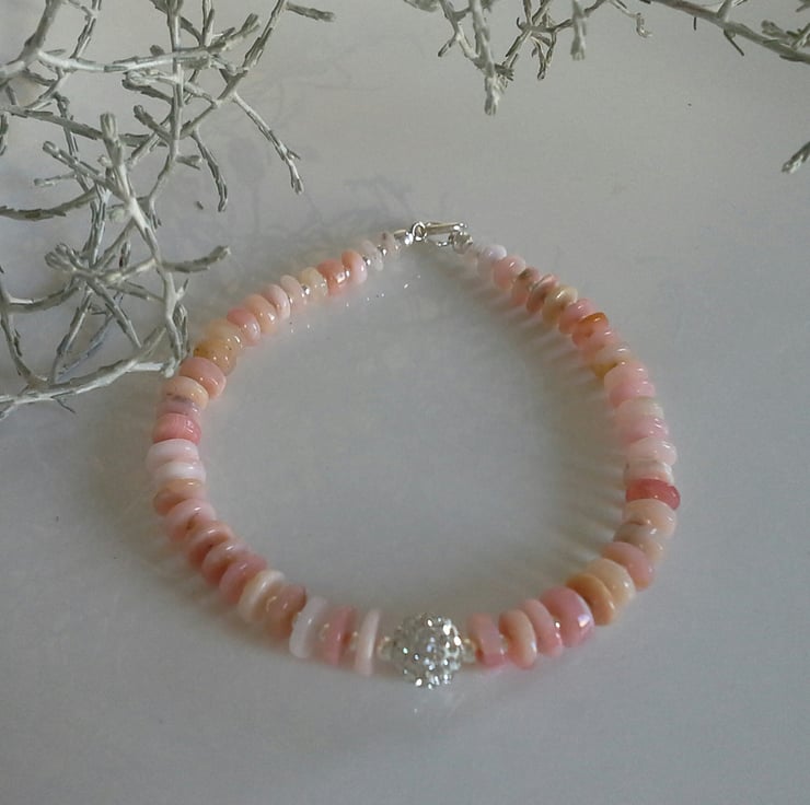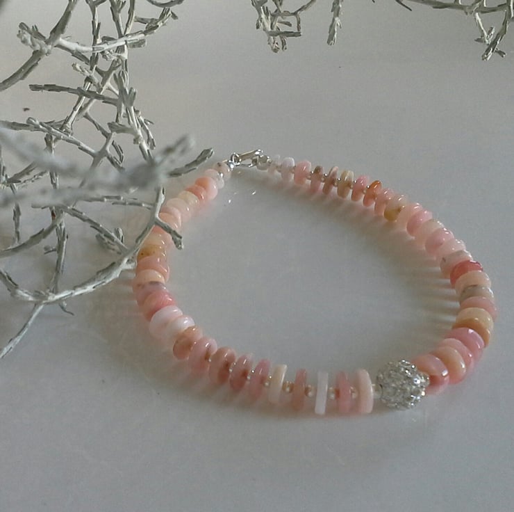 A pretty attractive bracelet designed and created using irregular flat cut natural untreated Puruvian pink opal gemstones which graduate in size from front to back. Between each opal is a 925 sterling silver bead with an eye catching disco Swarovsky round bead adding a touch of glamour and brilliant sparkle.