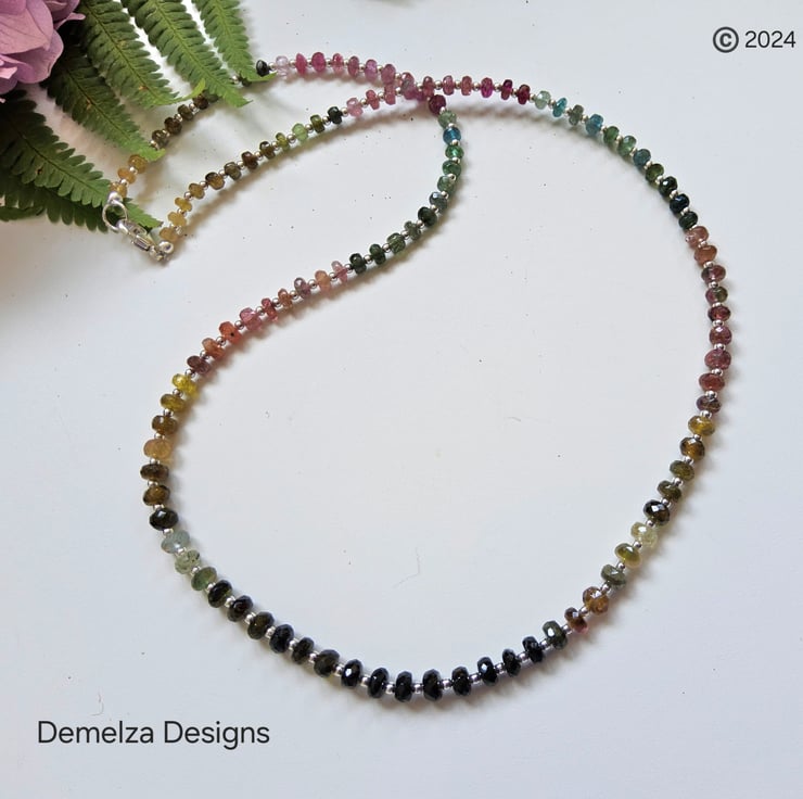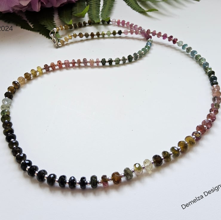 A beautiful necklace hand crafted and designed using shades of genuine AA grade faceted tourmaline rondelles which graduate in size from front to back. Between each tourmaline gemstone is a 2mm 925 sterling silver bead. For the main construction professional stainless steel jewellers wire has been used for added strength and lasting durability, finished off with a 925 sterling silver clasp, D ring and crimp covers.