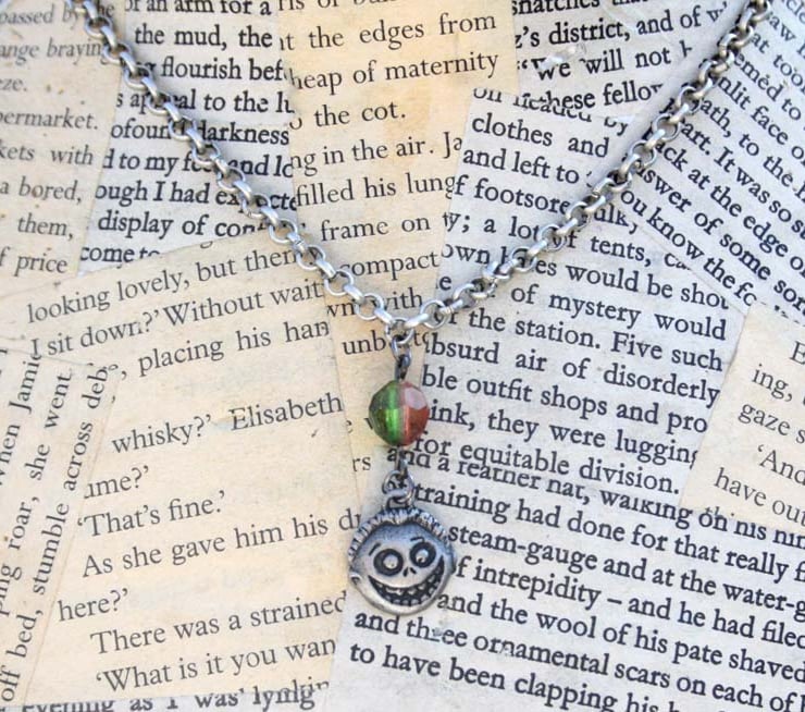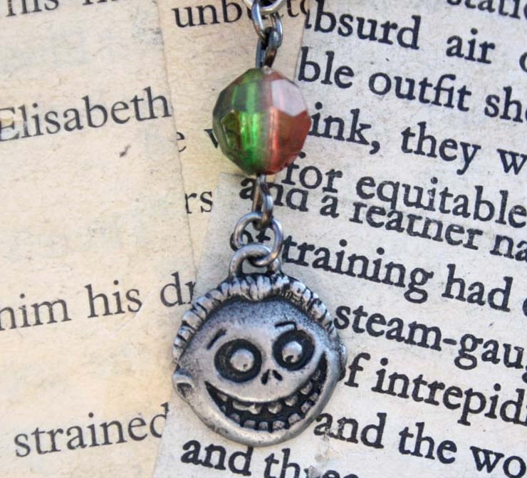 The face of little Barrel from Tim Burton's 'The Nightmare Before Christmas' hangs from an orange and green facet cut bead. And what an adorable face it is!