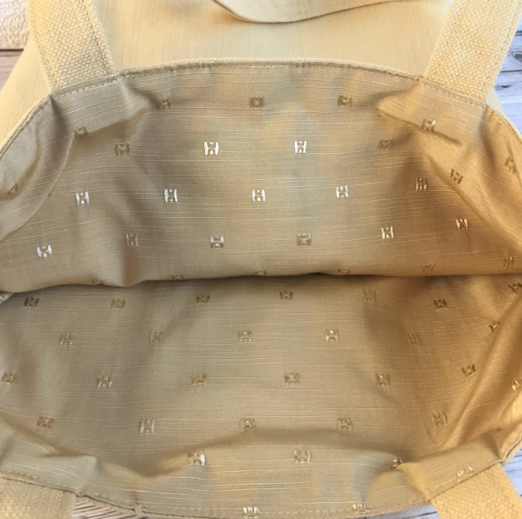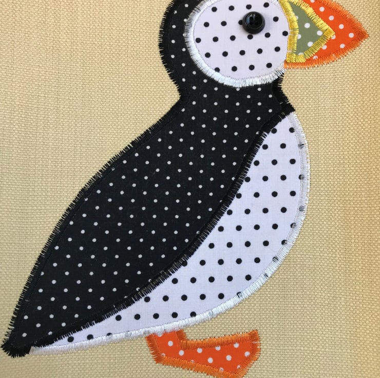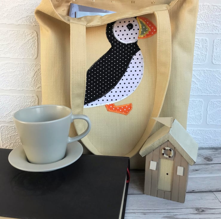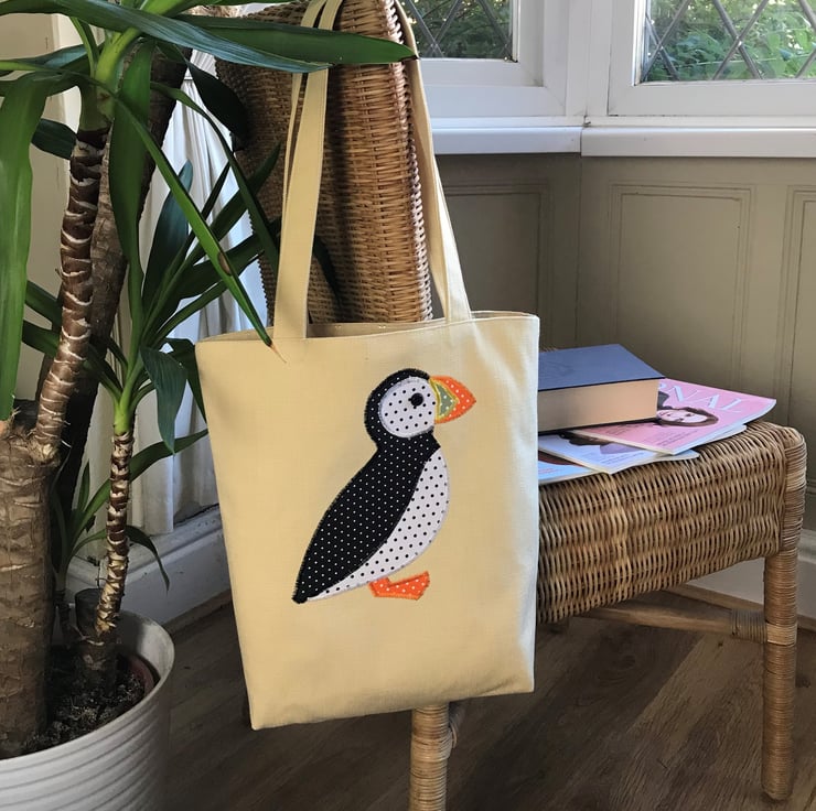 A Puffin tote bag in a lovely pale golden yellow fabric with a cute applique polka dot Puffin. The Puffin is made from black fabric with tiny white polka dots and white fabric with black polka dots. Its beak has orange and green sections, both with white polka dots, and is embellished with golden yellow machined satin stitch, to show the characteristic colours and markings of a Puffin's beak. It has an orange polka dot foot and a black button eye. The bag is fully lined with pale golden yellow fabric with a pattern of little shiny squares.