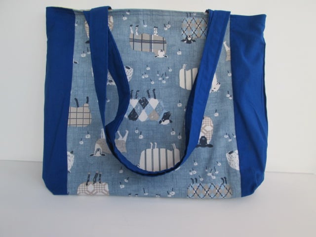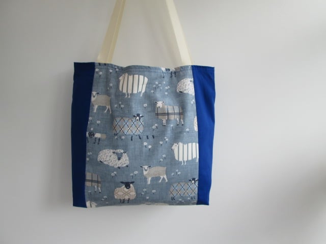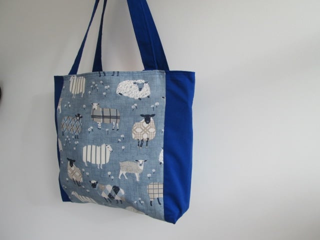Fully lined blue sheep tote bag 16" x 15" with 30" handles and squared bottom