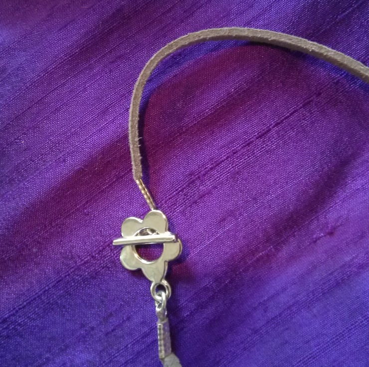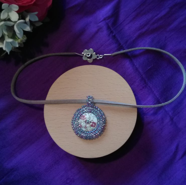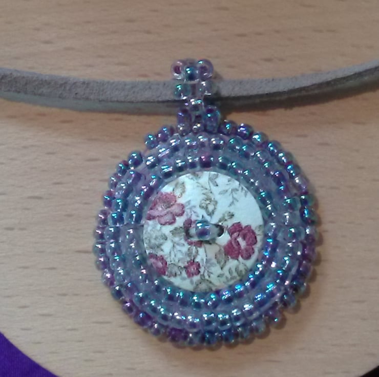 This pendant has a floral button at the centre, in shades of purple and grey on a white background. It sits in a frame of bead embroidered amethyst lined miyuki seed beads and has a beaded bail in the same colours. Backed with soft grey Ultrasuede, it hangs from a length of grey microfibre suede thong and is finished with a pretty flower shaped toggle clasp, so is really easy to fasten.