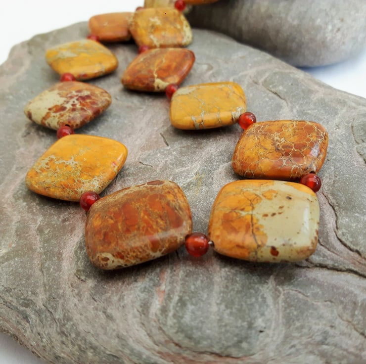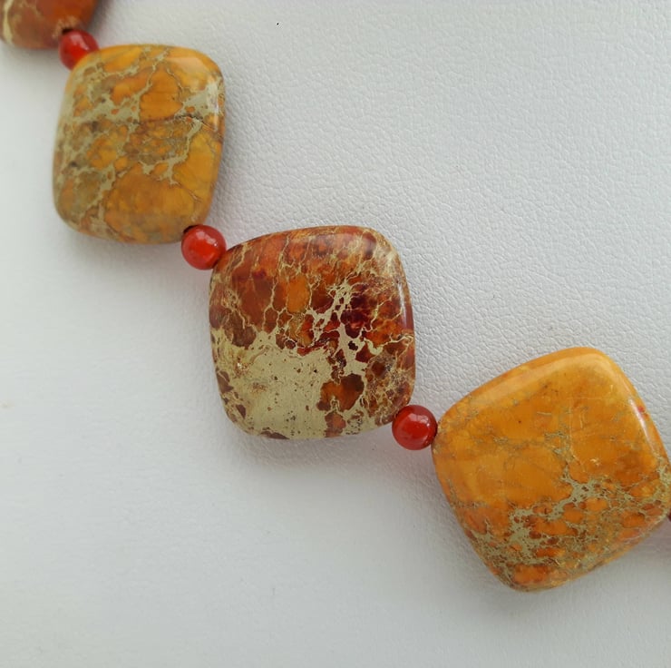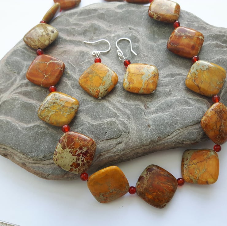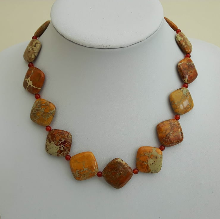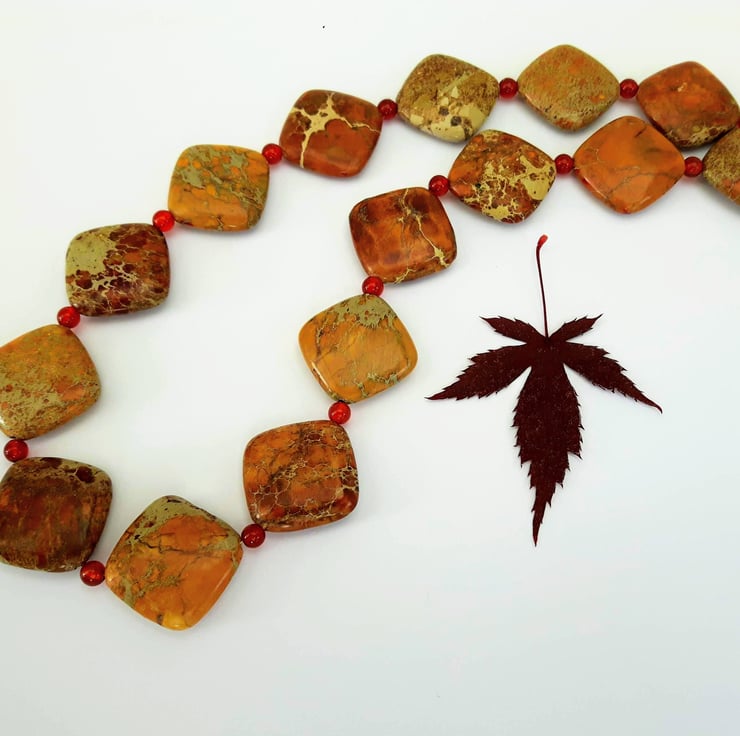 This gorgeous seasonal necklace features square cushion-shaped beads of semi-precious Jasper in stunning autumnal shades of gold, brown and terra cotta. Between the Jasper beads I have inserted small round beads of berry-red Carnelian. The beads are mounted on strong beading wire and the necklace is fastened with a Sterling Silver lobster clasp. It will be packaged in a smart gift box or bag and sent to you by Royal Mail first class post. Matching earrings are available from my Folksy shop - see last photo. If you buy the two items together you can obtain a 10% discount on the total price by entering the Discount Code SET10 at checkout.