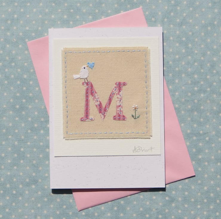 A hand-stitched card with the letter 'M' cut from pretty pink fabric stitched into place with tiny stitches. I have added a miniature applique dove with heart in her beak, and then embroidered a tiny daisy flower to complete the design.