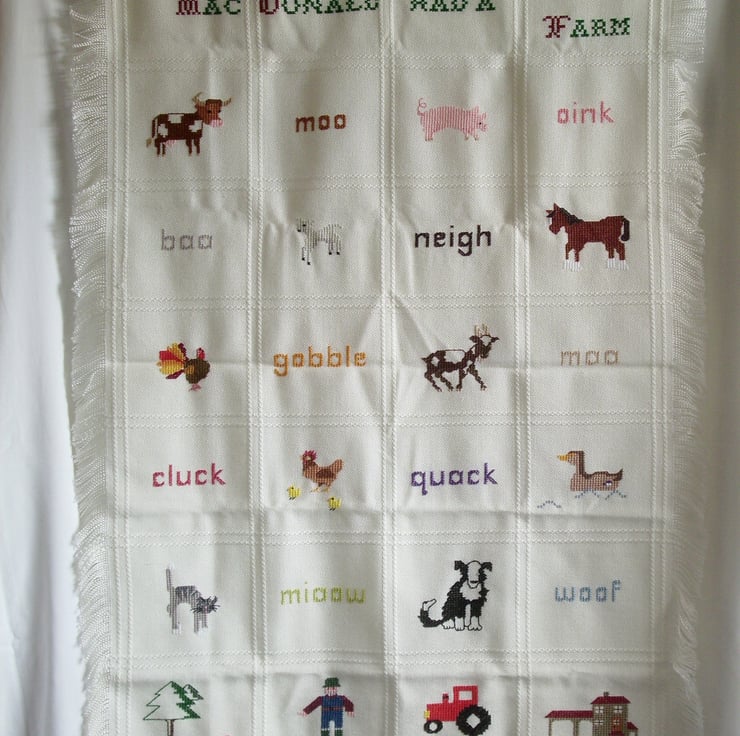This is a cream acrylic hand-embroidered Afghan shawl, cot blanket or wall-hanging. I have fringed the edges and designed and stitched the story of Old MacDonald's farm in pictures in the squares. The shawl measures 24" (62cm.) by 36" (92cm.) approximately within the fringe. The threads are colour-fast and the shawl can be hand-washed in cool water.