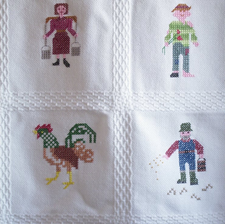 I can't resist designing and embroidering nursery rhymes and stories to fit into the squares of Afghan fabric. Old MacDonald's Farm fitted the bill!