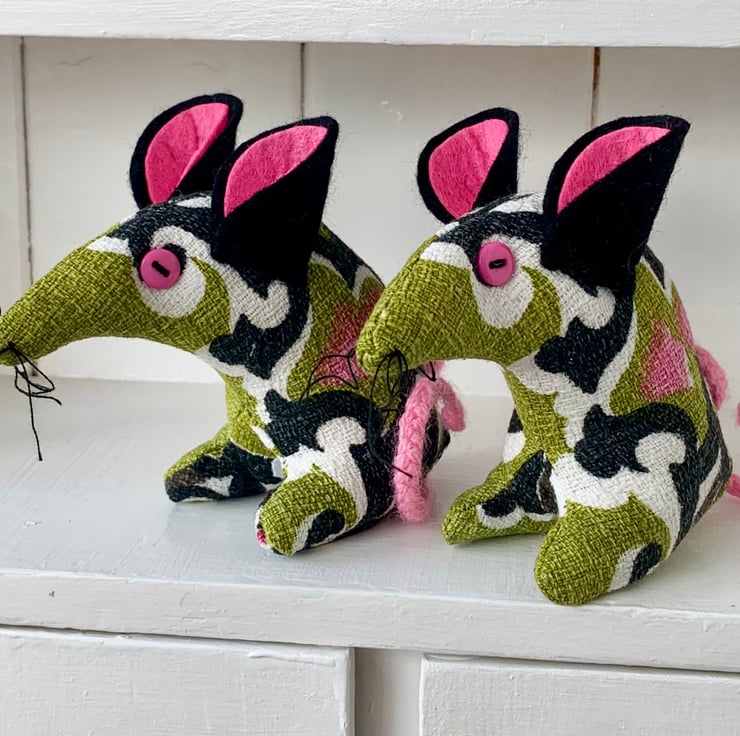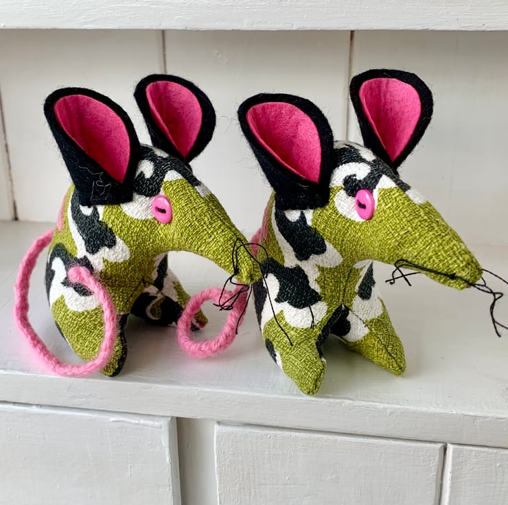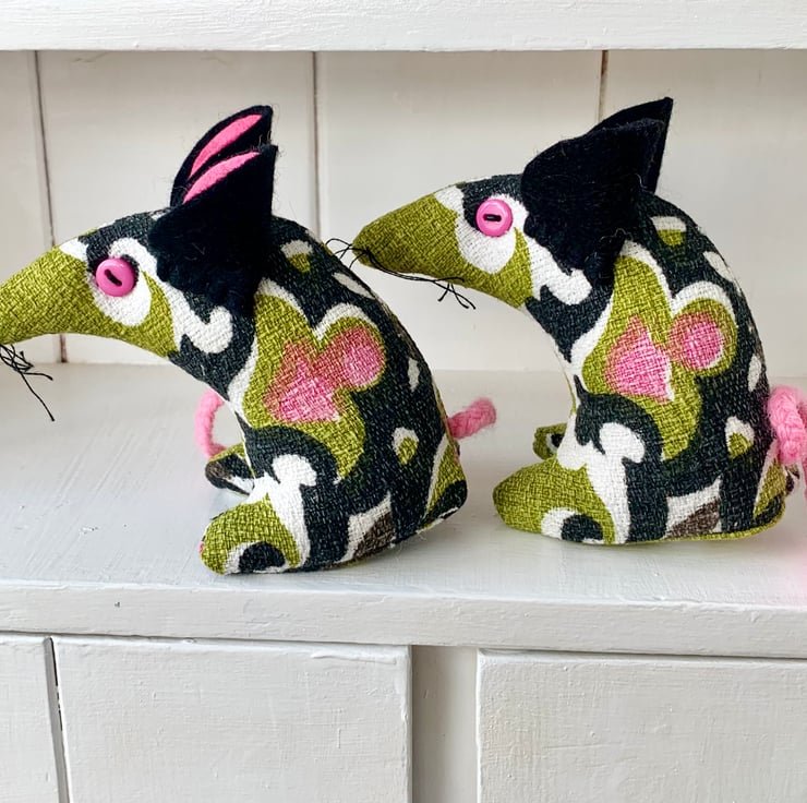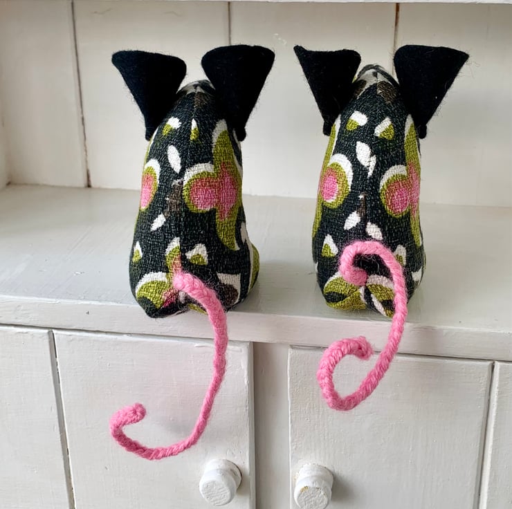 Retro 'tastic mouse has button eyes, felt ears and a plaited wool tail and cotton whiskers. Approx 10cm tall from the tips of the toes to the top of the ears and approx 11cm from his nose to her bottom.