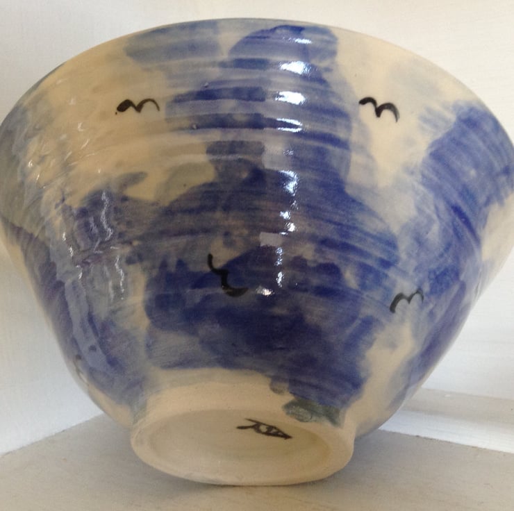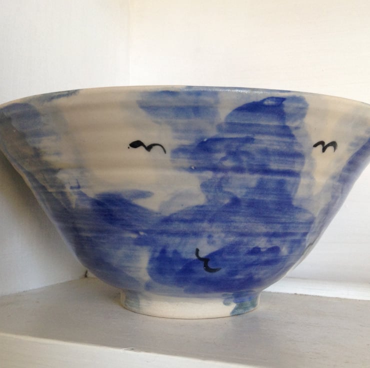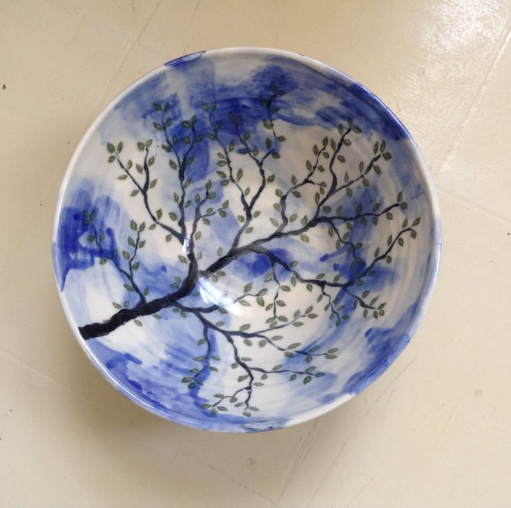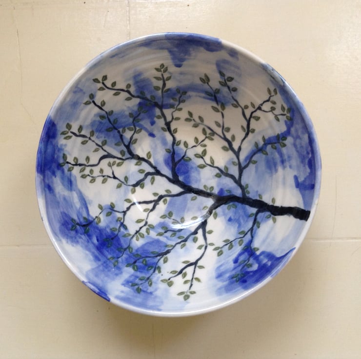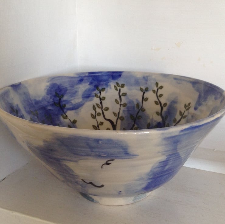 Charming blue stoneware bowl with a little tree against sky, clouds and birds. The bowl is hand thrown and hand painted and is high fired and therefore it is microwave and dishwasher safe. It measures 22 cms across and is 9.5 cms high.