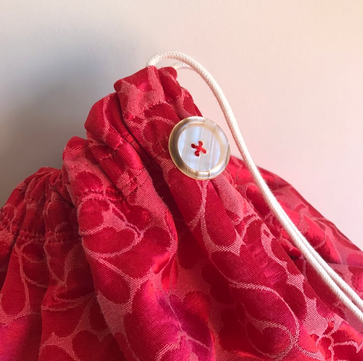 The bag measures approximately 60cm square when flat and pulls up with a cream cotton cord. It is trimmed with a large pearl effect button. All seams are neatly finished so the bag can be used year after year, or maybe as a laundry or storage bag.