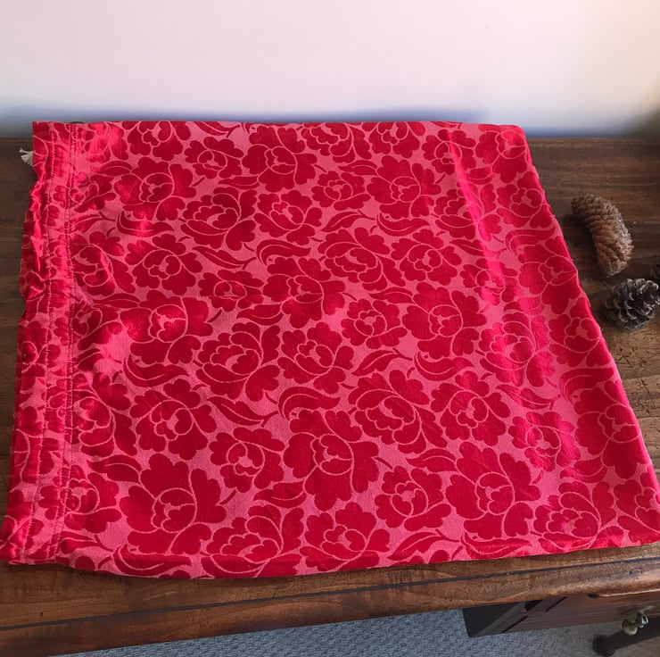 Generously sized Christmas sack made from vintage fifties curtain material. The fabric is a beautiful, rich shade of red with a sumptuous sheen and pretty floral design.