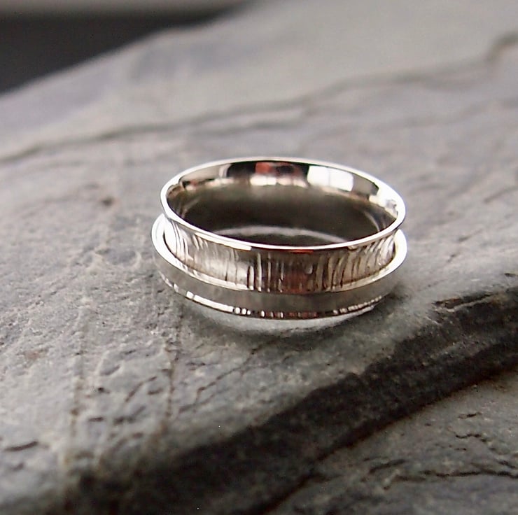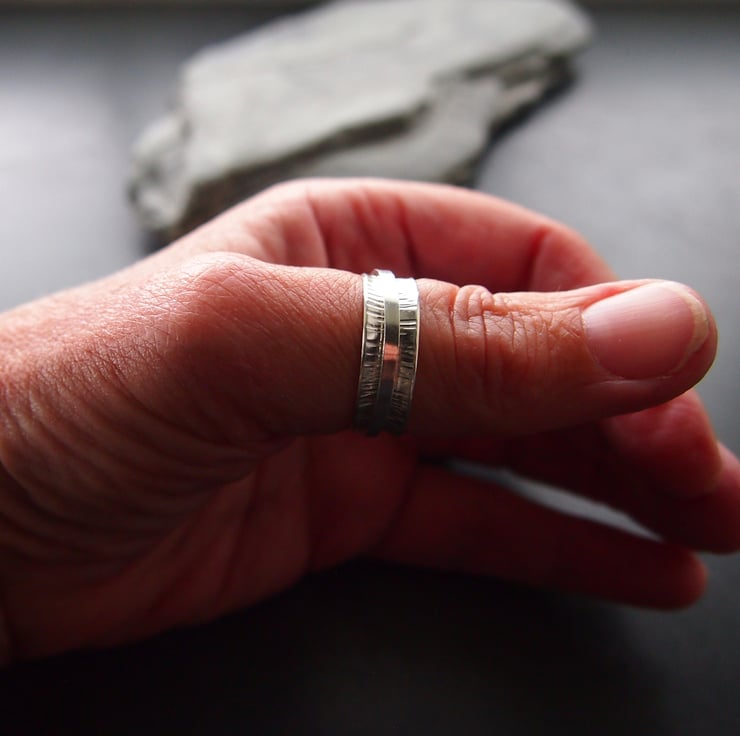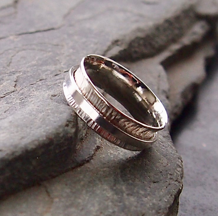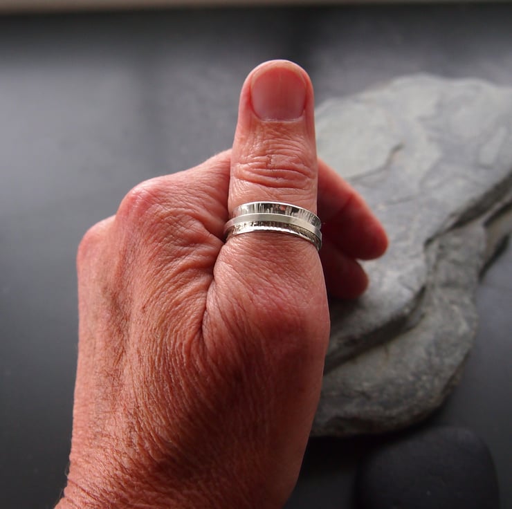 A 7mm wide sterling silver polished and textured band has been gently flared to hold a freely spinning hammered ring. The band is a 2mm wide and d shaped so that it turns smoothly.