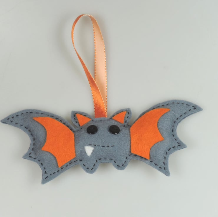 Handmade felt bat decoration, Fun and quirky handmade Halloween bat, made from wool felt, using buttons for eye detail. Hand stitched mouth detail with white felt tooth.