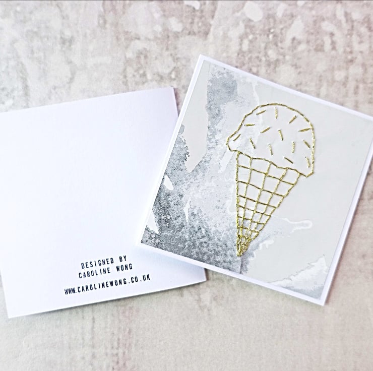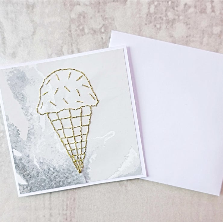 - Hand stitched card made with metallic threads to give a tactile feel.
