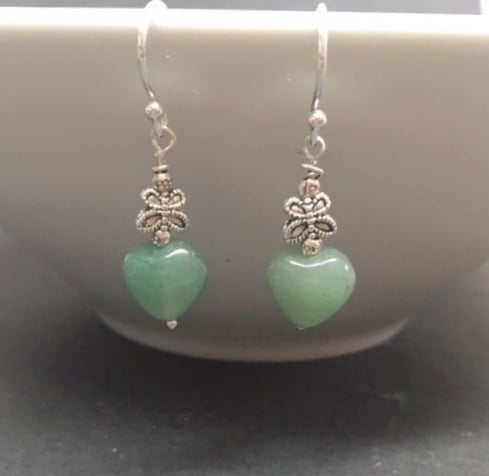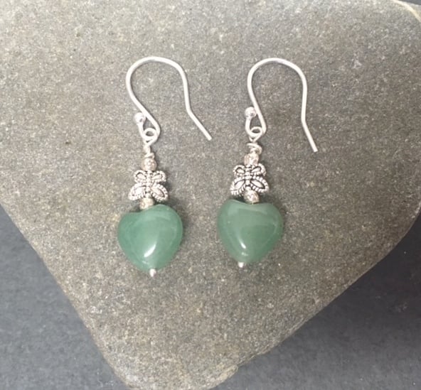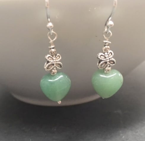 Green Aventurine Heart Earrings with Butterfly Charm - Handmade earrings made with green Aventurine heart semi precious gemstones. I wire-wrapped with Sterling Silver wire and attached to 7mm butterfly beads. The earrings hang from Sterling Silver earwires.