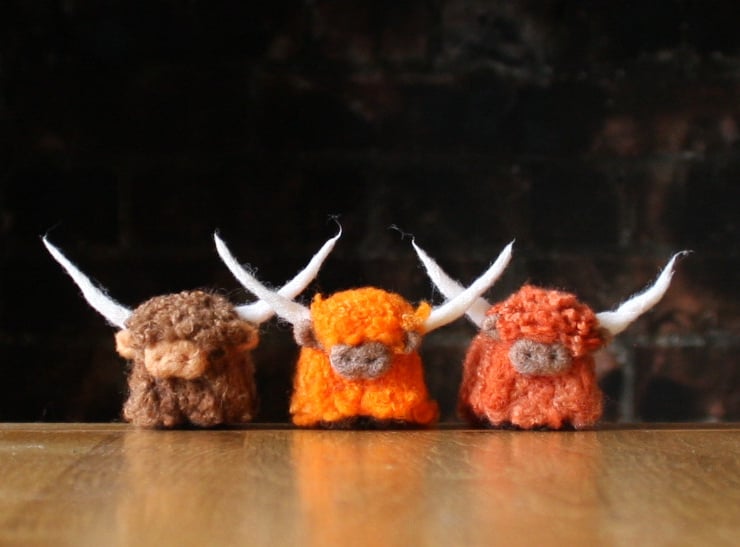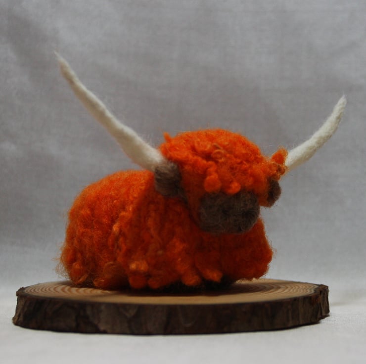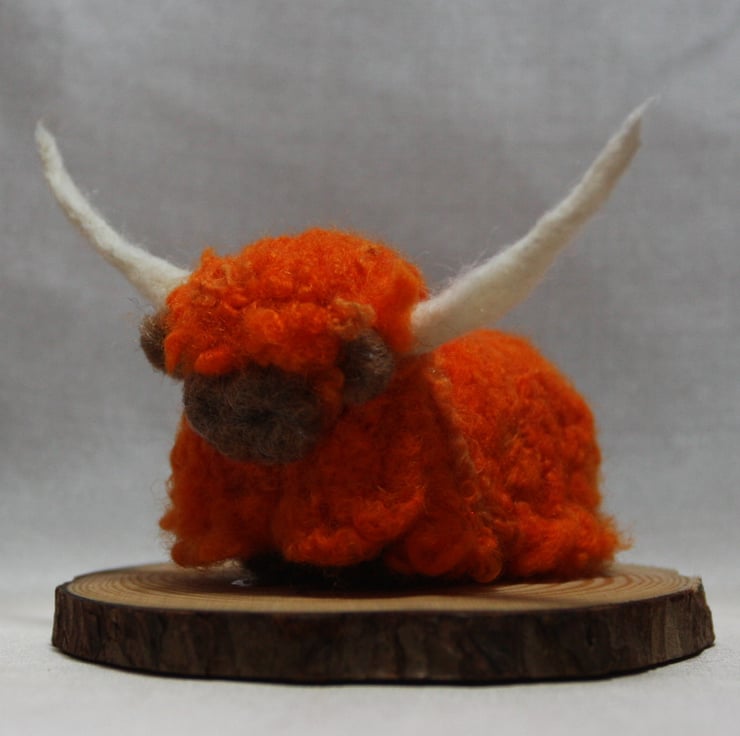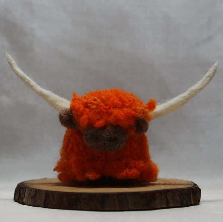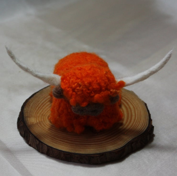 Dinky little needle felted highland cow ornament with a bright orange coat.