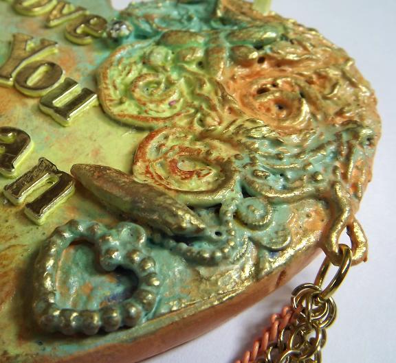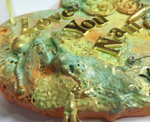I have decorated this mdf heart with fabric,lace and various recycled bits of broken jewellery, then painted it and added chain dangles, a painted key, a bobbly bead with a piece of peach lace and a peach shell bead with a piece of lemon lace. The heart is approx 10 x 10 cms x 6mm, it has a lemon ribbon hanger and a butterfly charm at the bottom, the letters are stacked die cuts.