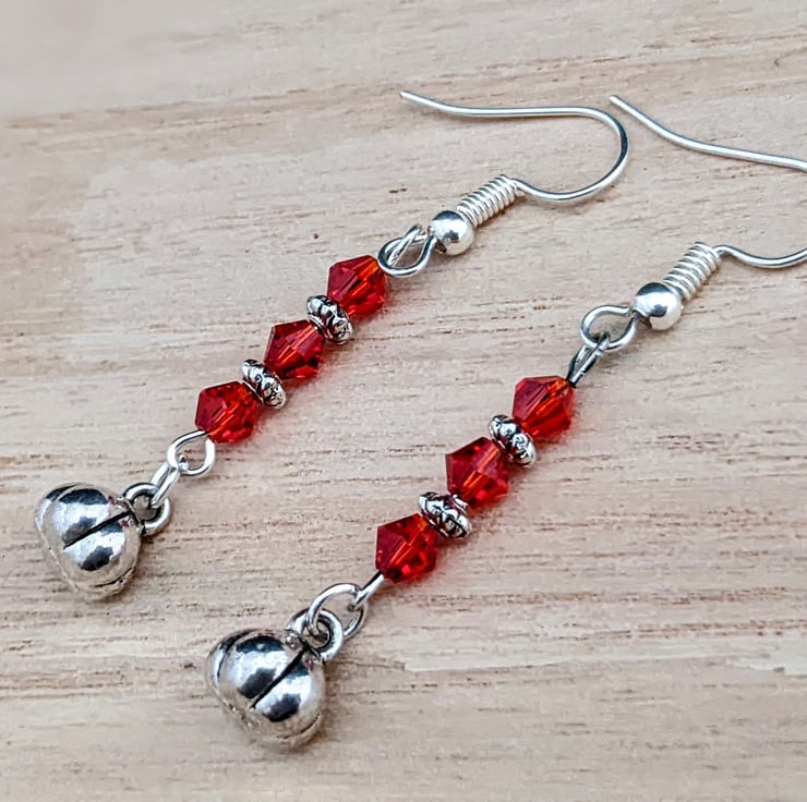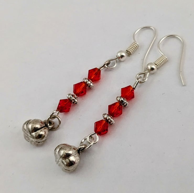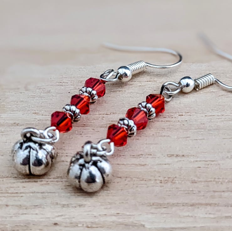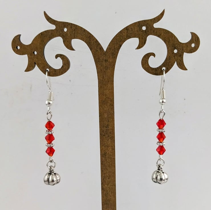 6mm 3D Tibetan silver pumpkins and 4mm red faceted bicone glass beads on hypo allergenic silver plated hooks. Approx 33mm long excluding hooks. In an organza gift bag.