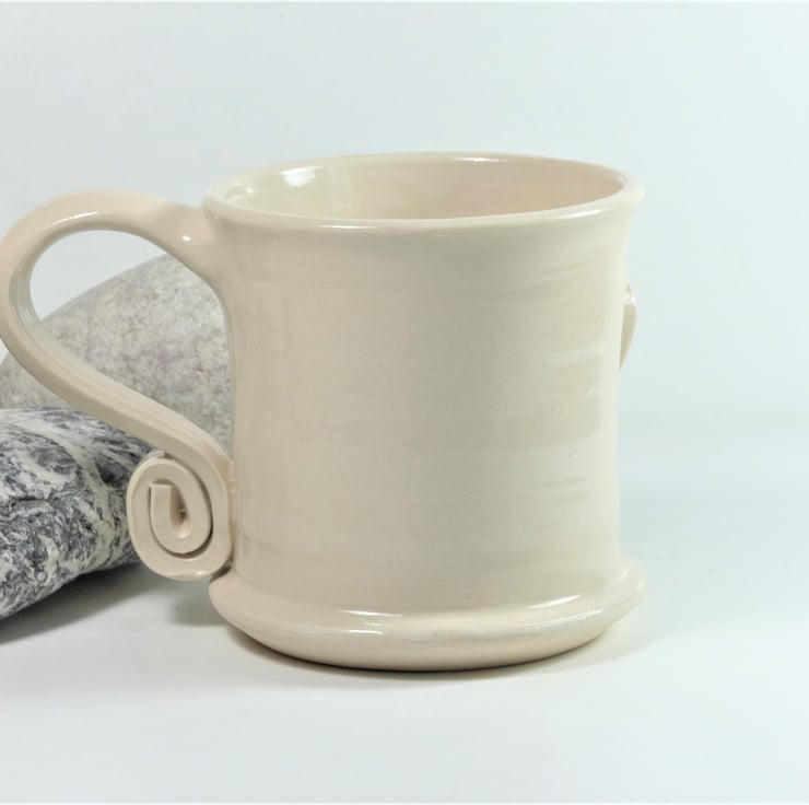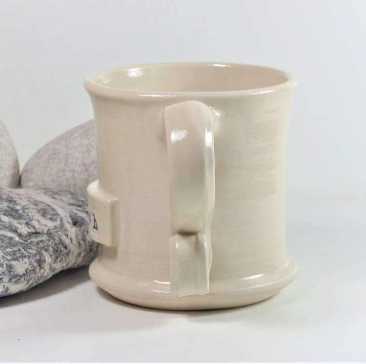 I threw this mug on the potter's wheel using a white stoneware clay. I then turned the base and added the handle and decoration before bisque firing the mug. I glazed it using a lovely transparent glaze and again fired it, this time to 1240C stoneware making it strong and durable.
