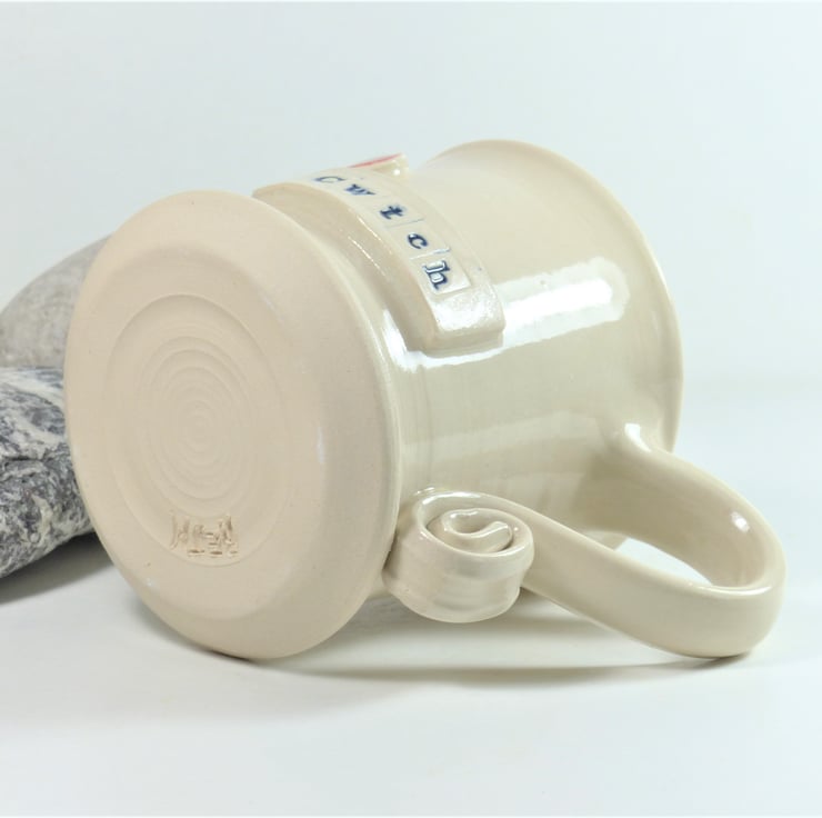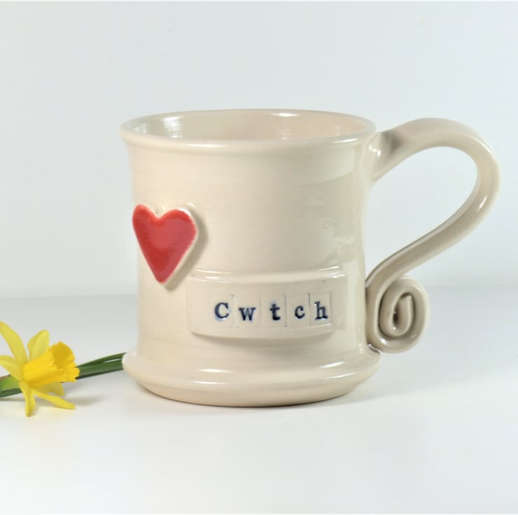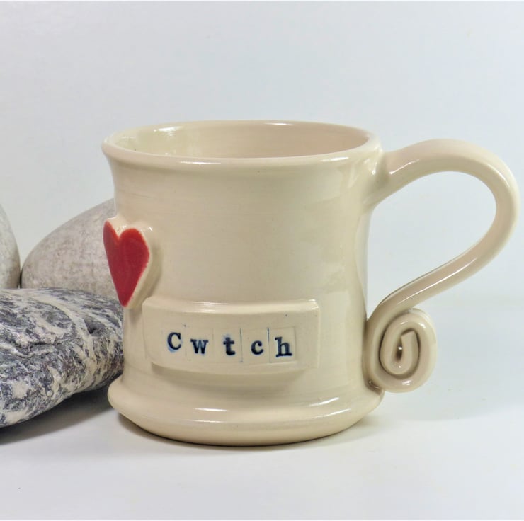 It has the words 'Cwtch' stamped into raised clay on the side of the mug.