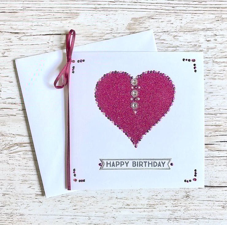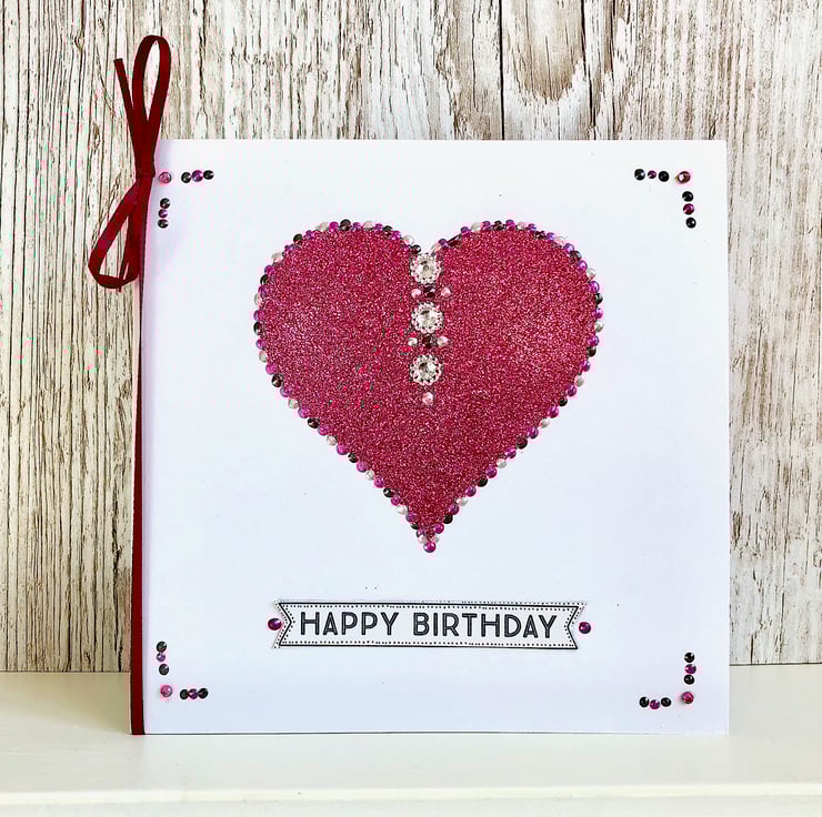Birthday card - Birthday card handmade by Heidi Meier. Bright fuchsia pink glitter heart edged with matching pink and black pearlised inks and faux jewels. Three faux diamonds give the heart added sparkle.