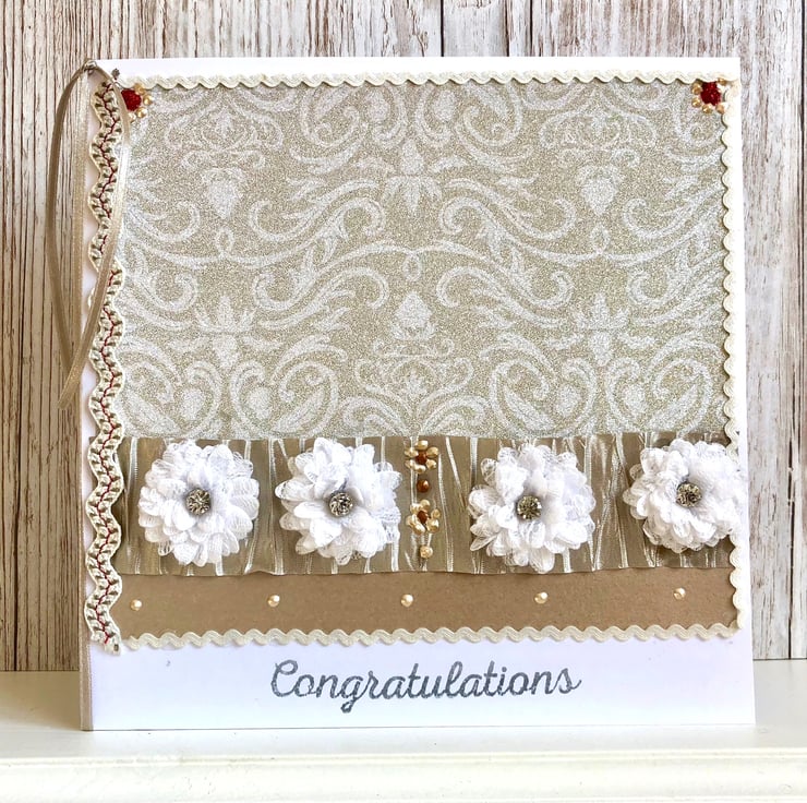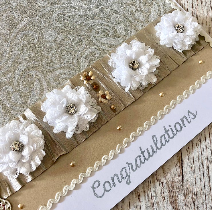 Wedding card - handmade wedding card made from a combination of quality papers, card stock and textiles. Lace flowers trimmed with faux diamonds are mounted onto a crinkly satin fat ribbon.
