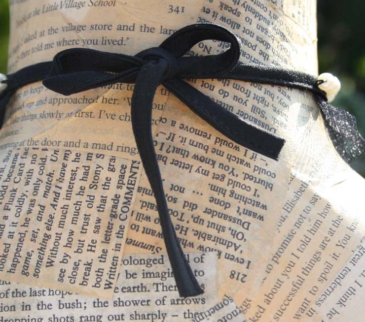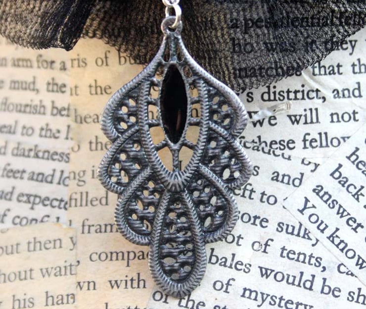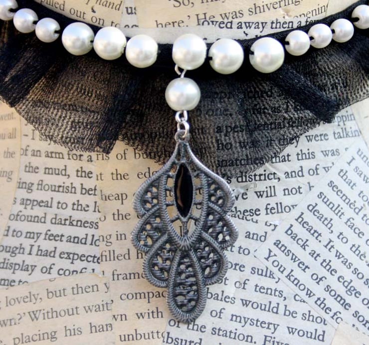 Pearl effect beads have been hand sewn onto a black tulle choker style necklace. From this hangs a gunmetal grew charm with black enamel insert.