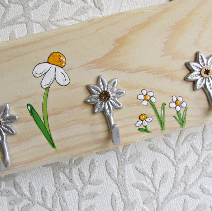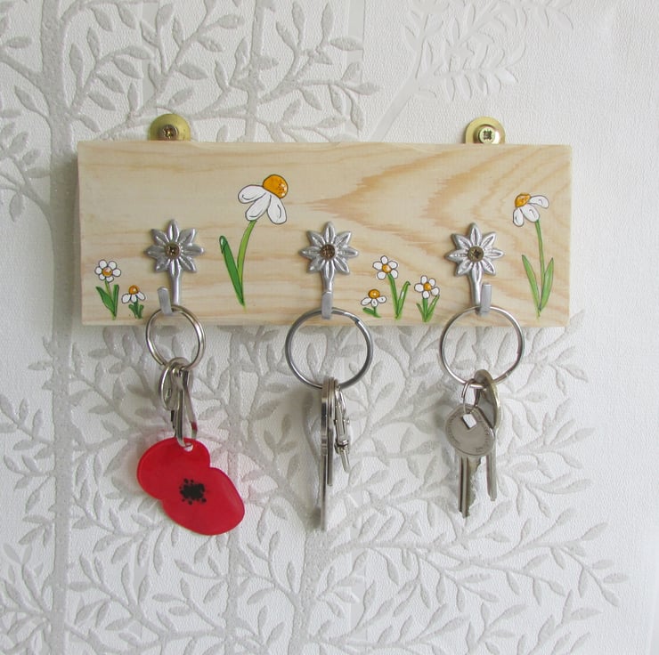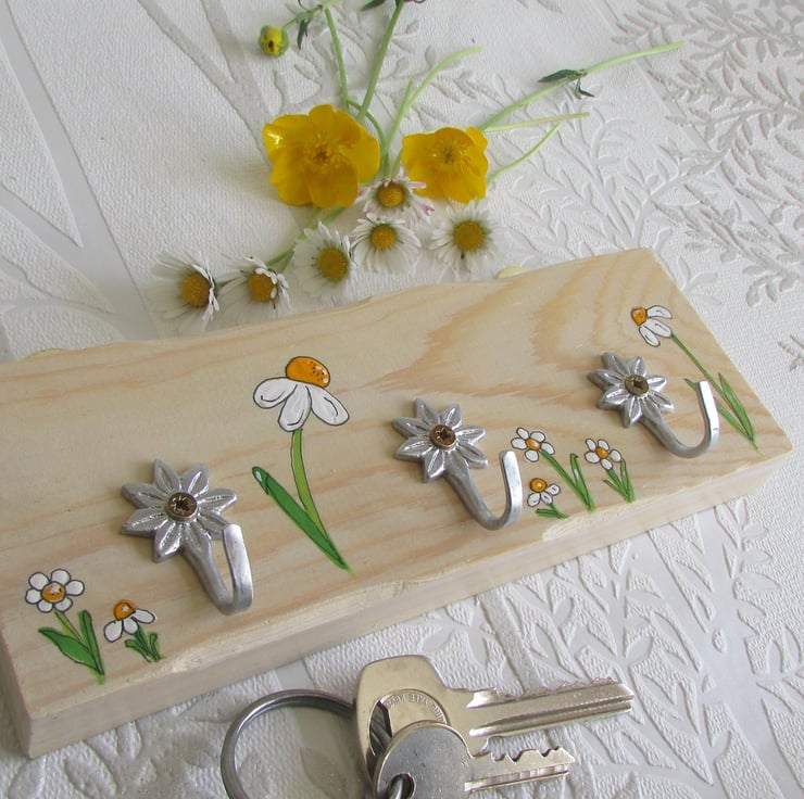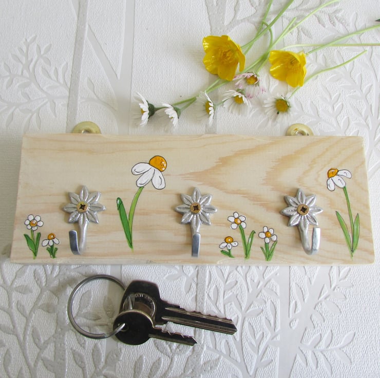 Wooden key holder hand painted with daisies.
