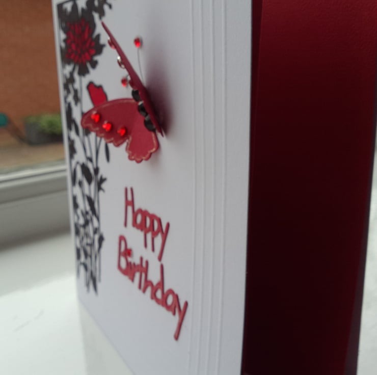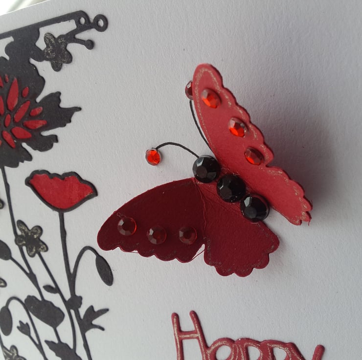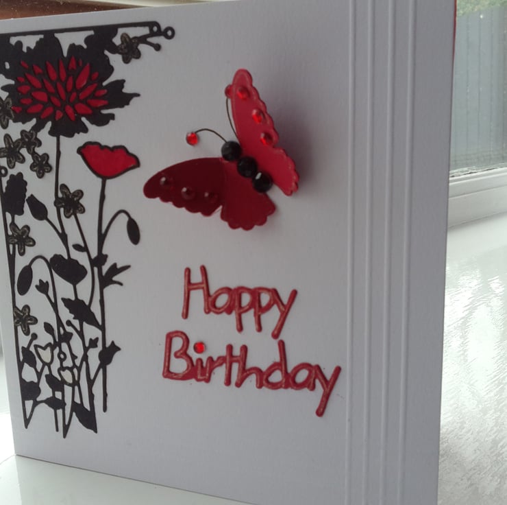 A completely handmade and uniquely designed card. Consisting of wild flowers die cut from black card and handcoloured in red.. a butterfly diecut from red card and decorated with rec and black rhinestones. Mounted on to pristine quality white card. Finished off with happy birthday die cut from red card