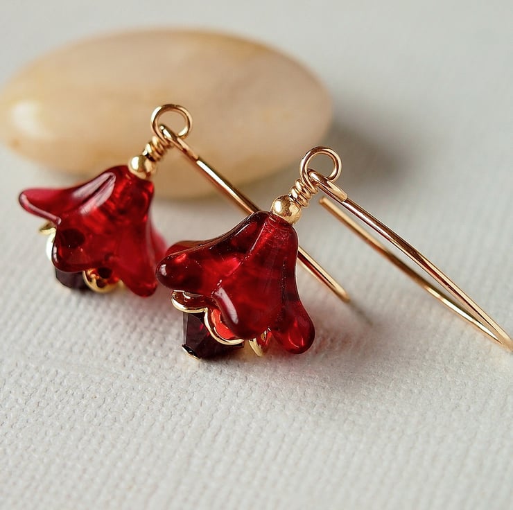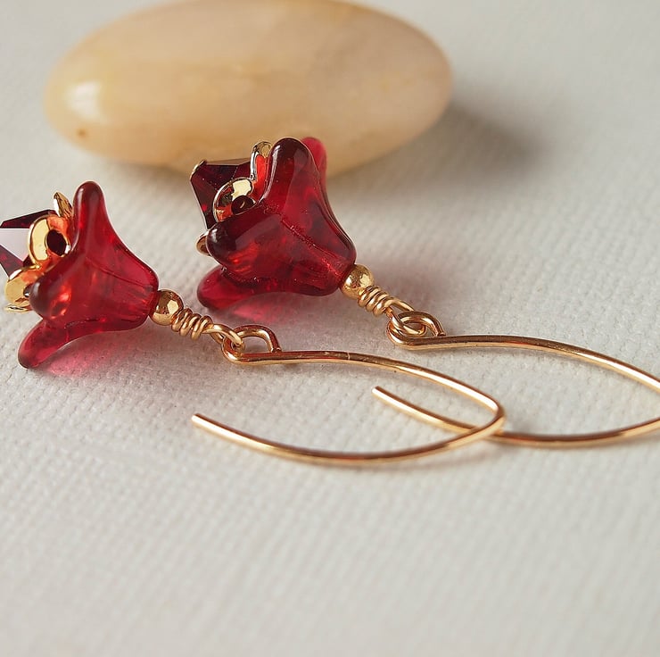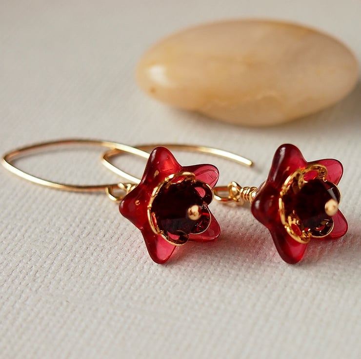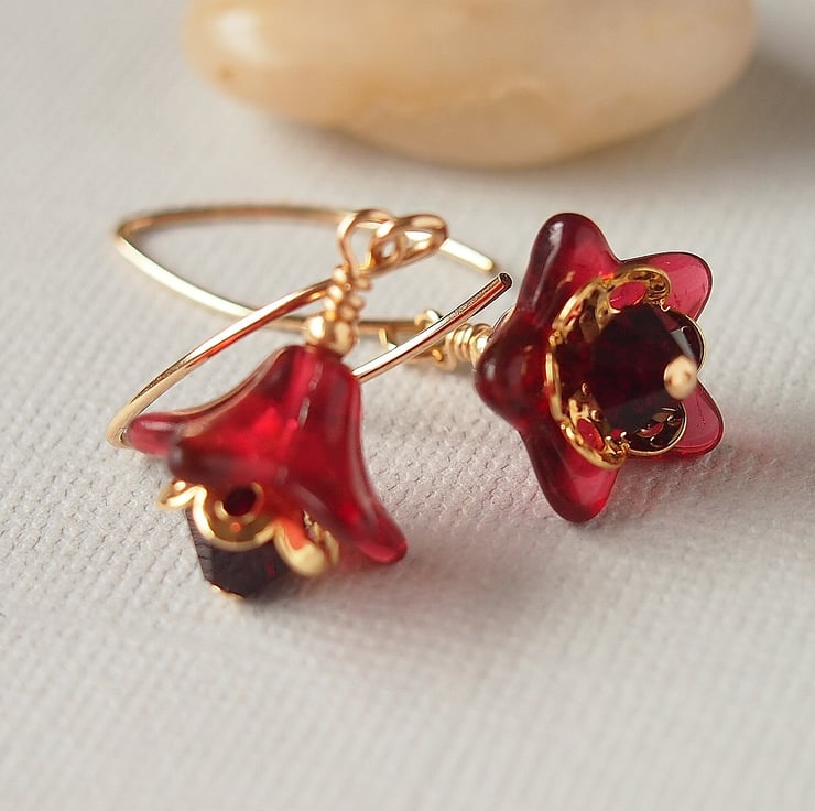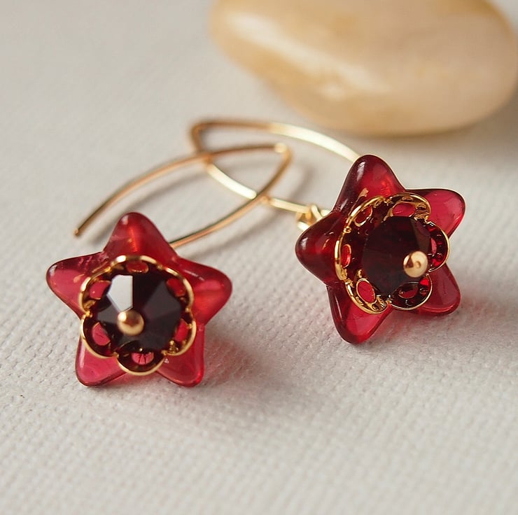 Pretty earrings featuring vintage style red glass flower beads.In the centre of the flower sits a gold filled bead cap with a dark red Swarovski crystal bicone. These dainty and feminine earrings have been completed using 14kt gold filled head pins, beads and ear wires I made especially for these earrings.