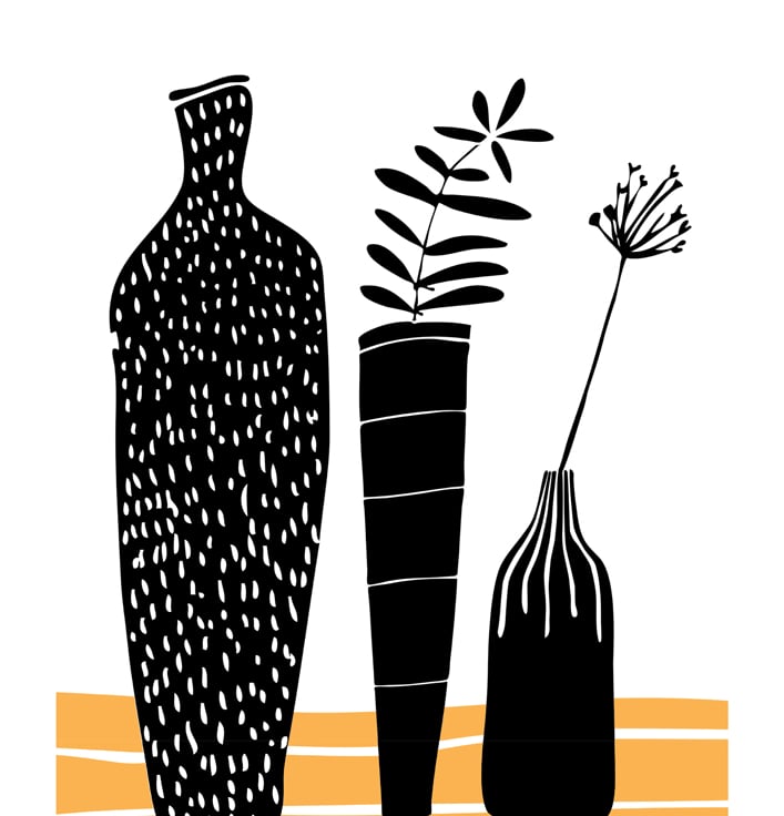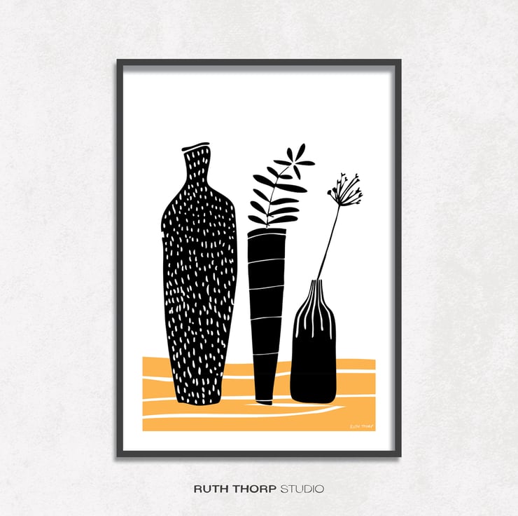 A striking graphic art print created as part of a range of illustrations inspired by household objects and the home. The elegant forms of the vases in black and white are set off nicely against a bright pop of golden yellow to brighten up your walls.