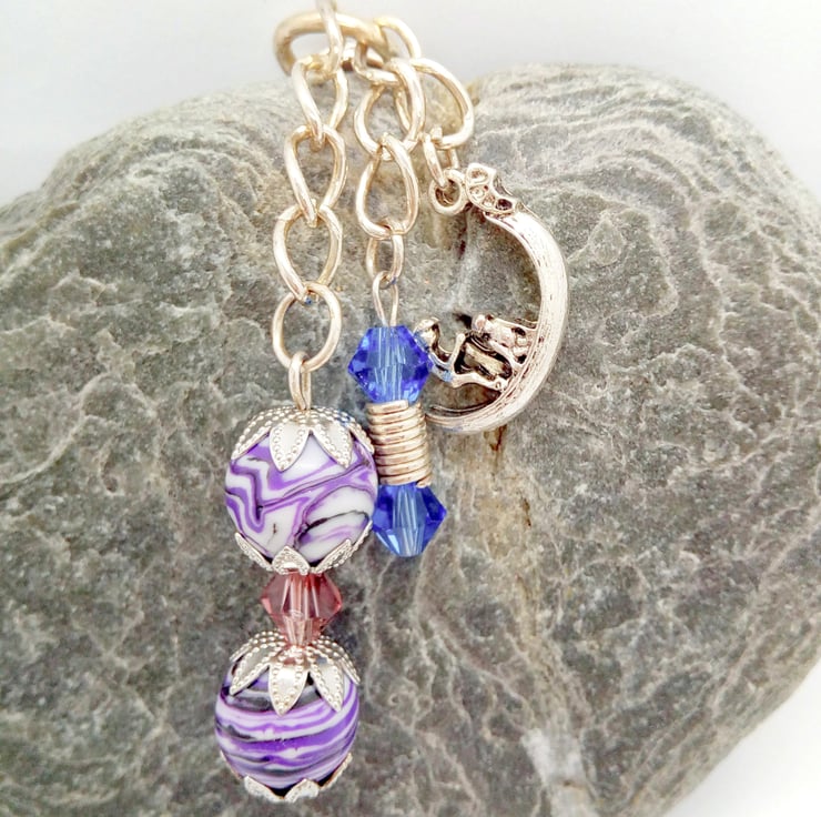 - a charm made using an 2 x 10 mm purple agate beads with silver plated spacer beads and a 6 mm pink crystal bicone bead