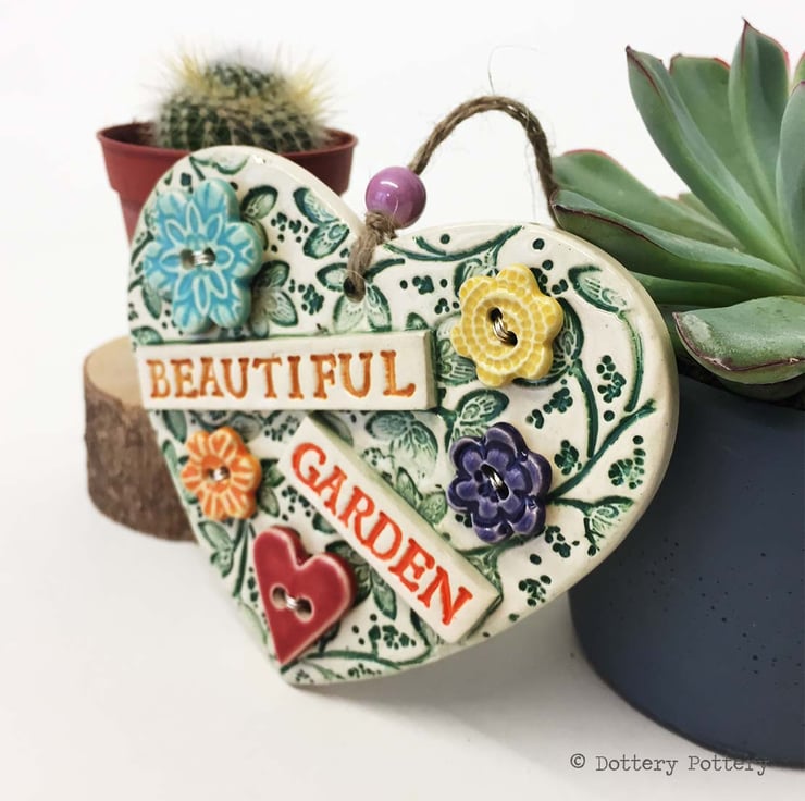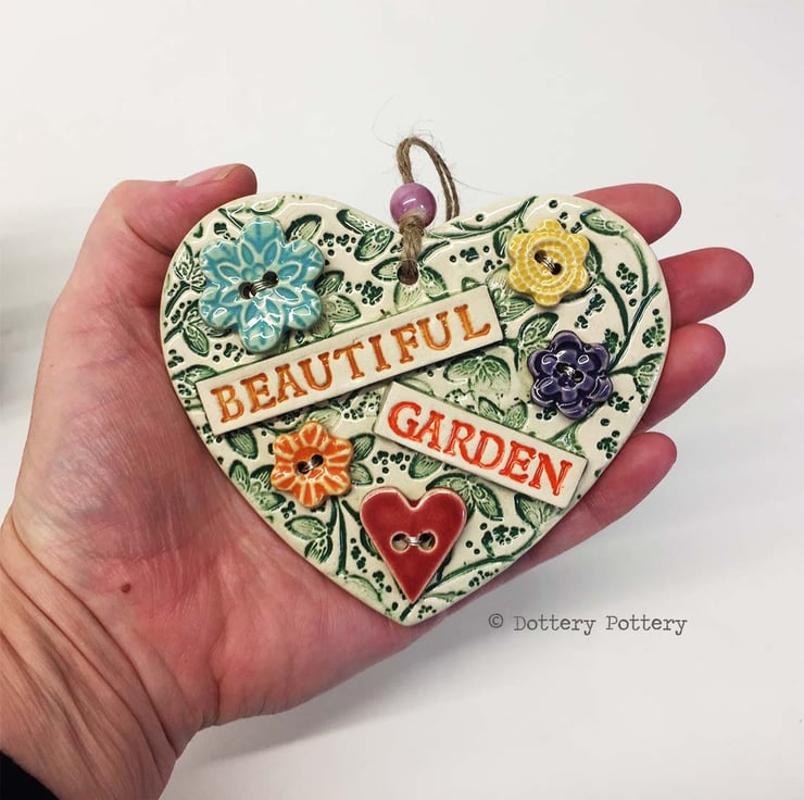 This ceramic heart is made from white earthenware clay. It has a floral theme with ceramic buttons wired onto the pottery heart with silver coloured wire.. 4" width (10 centimetres) and the same in height. Great gift for gardeners - can be hung outside.
