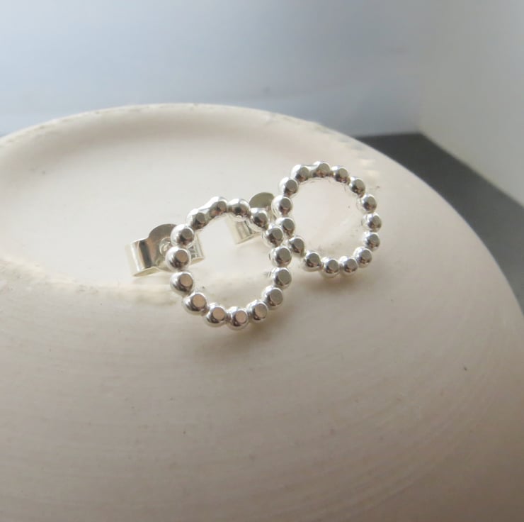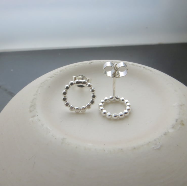 These small circle stud earrings have been made from sterling silver beaded wire, formed around a mandrel and soldered closed with ear posts added. Butterfly backs are included.