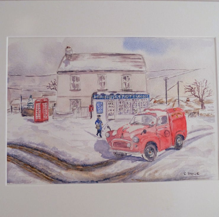My original watercolour of a Morris "Moggy" Minor Royal Mail van. "Moggy on the Moor". I have placed it in a snowy winter scene in the village of Minions on Bodmin Moor, near my home in Cornwall.