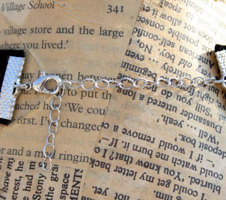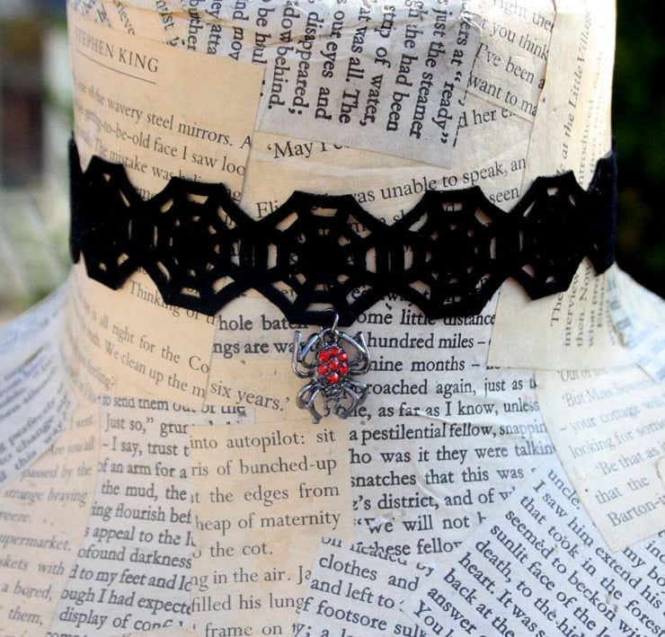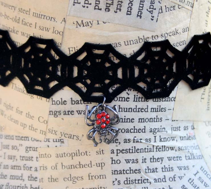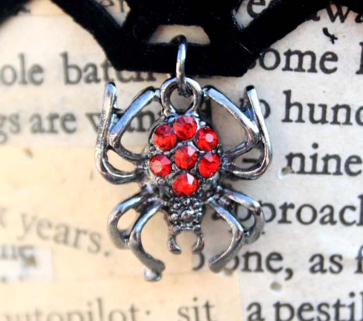 This necklace combines the 90s choker trend with the Halloween theme. Hanging from black velvet in a cobweb design is a gunmetal spider encrusted with red gems.